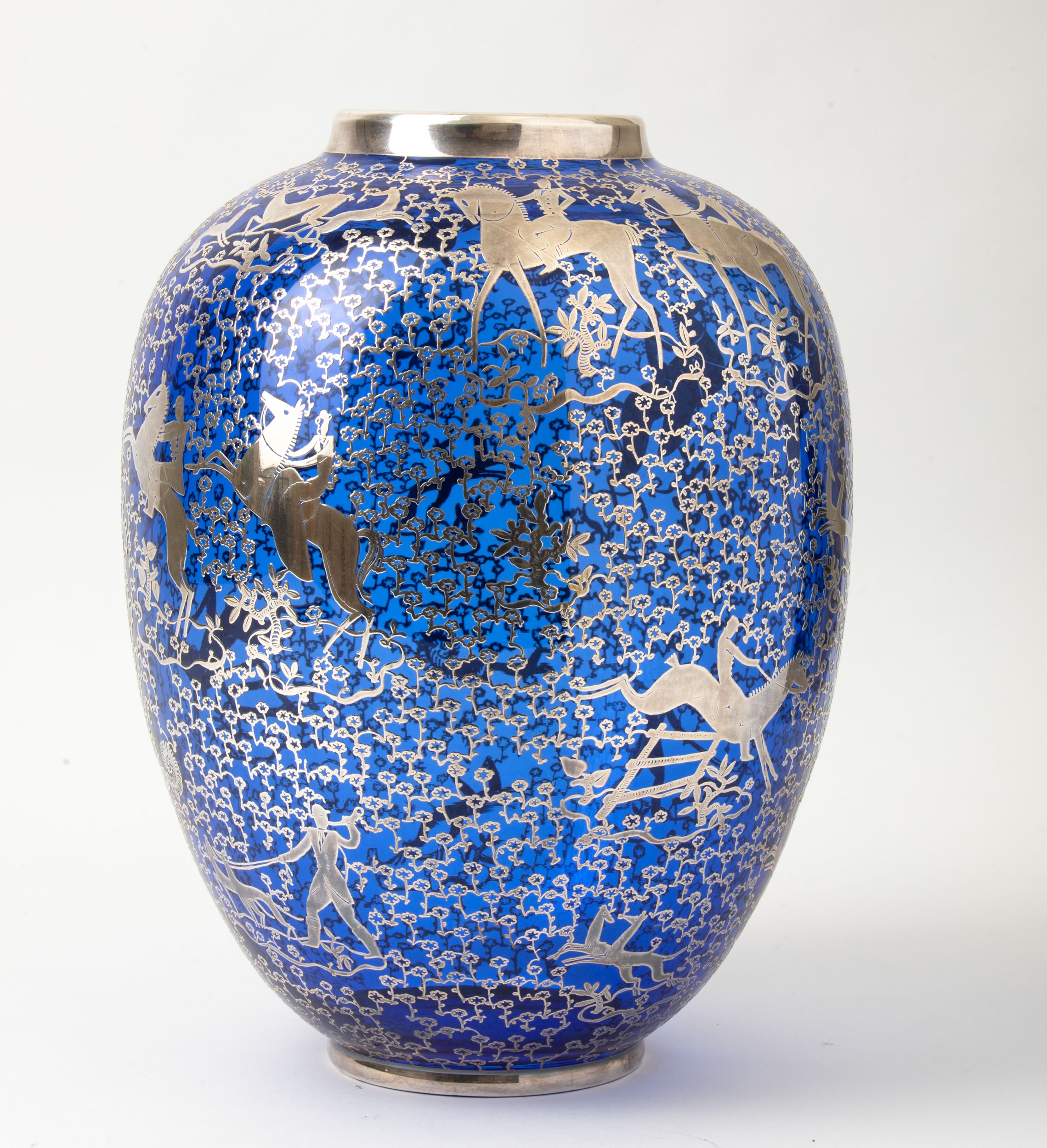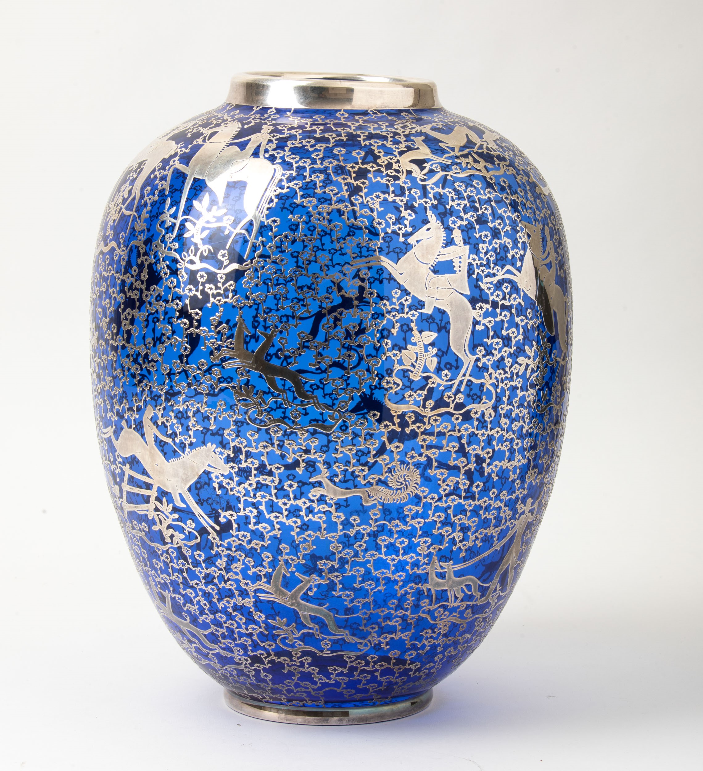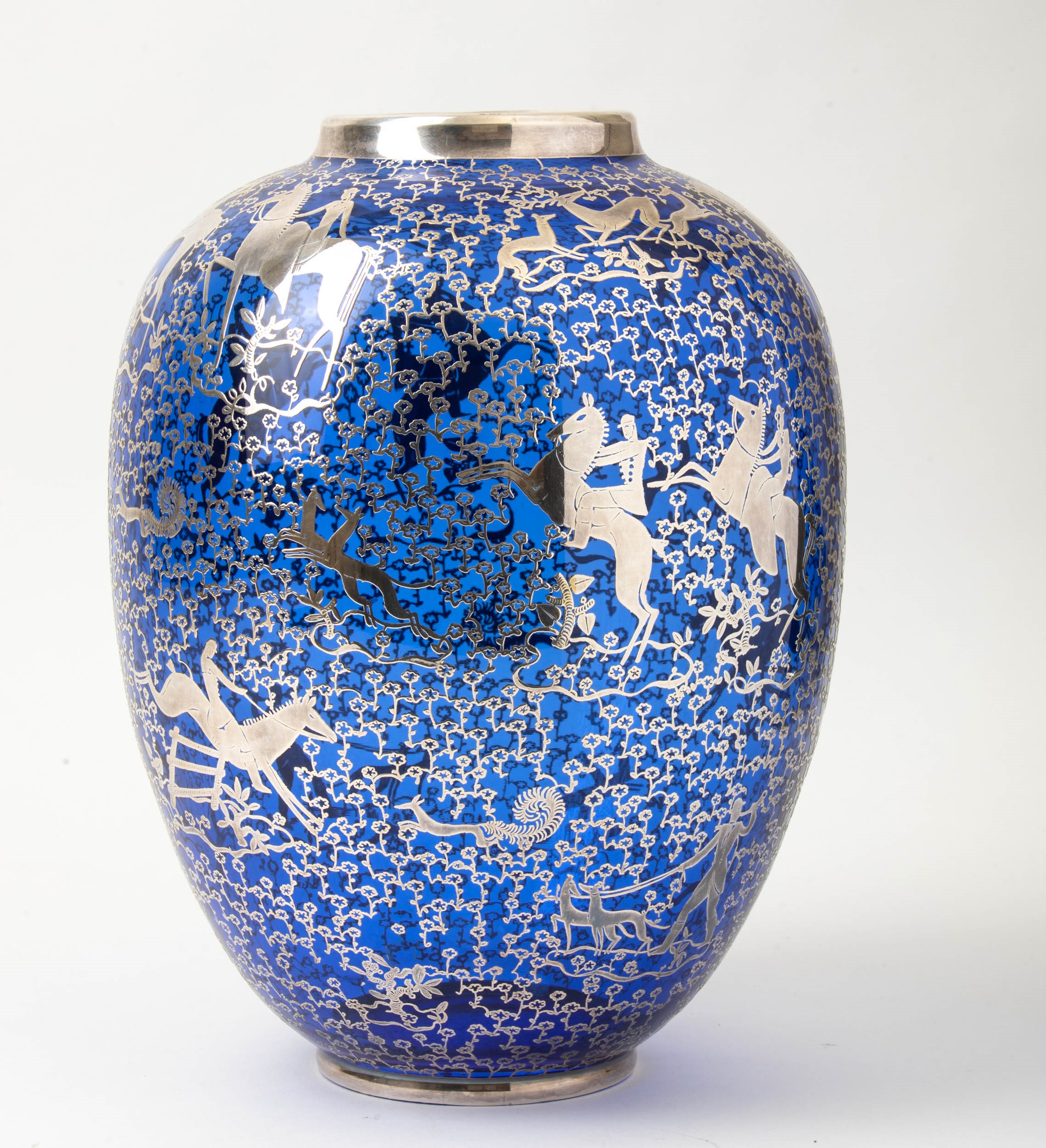 Grande vaso in cristallo blu di forma ovoidale con decoro applicato d'argento di cavalli e cavalieri.