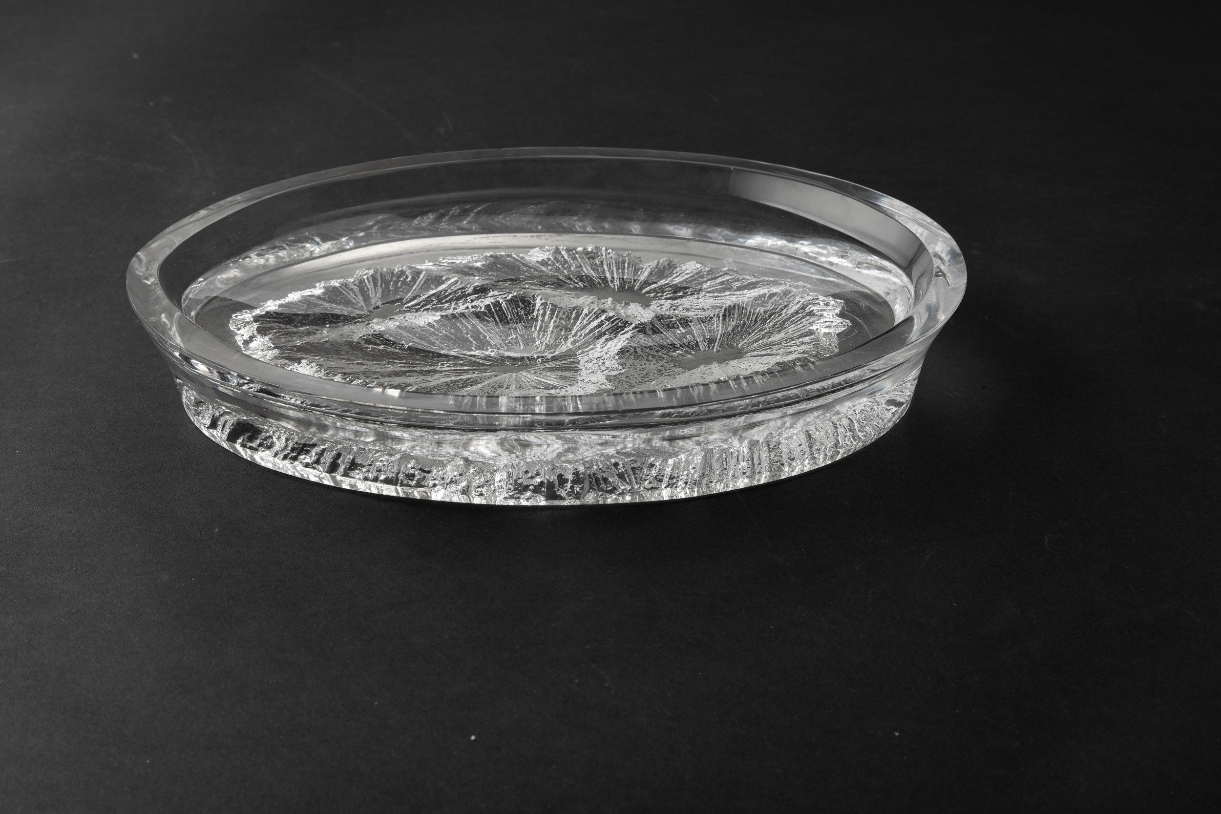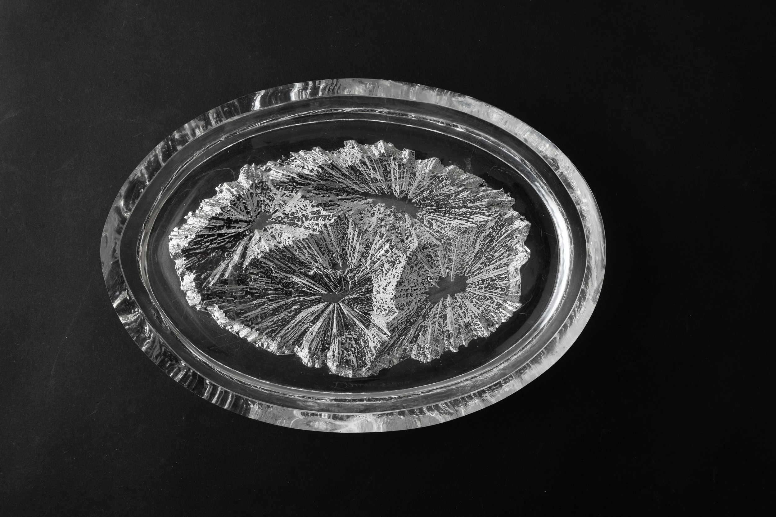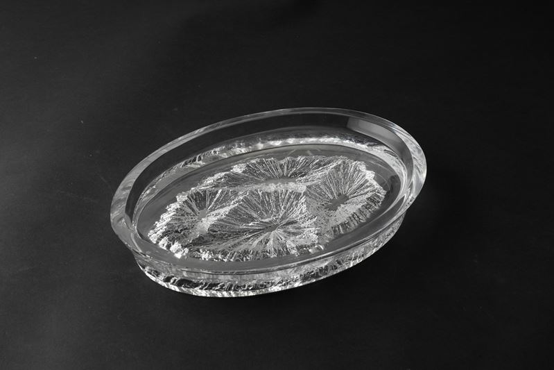 Vassoio ovale in cristallo con decoro astratto impresso.