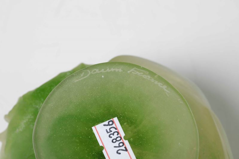 Coppia di coppe in pasta vitrea verde in forma di foglia.