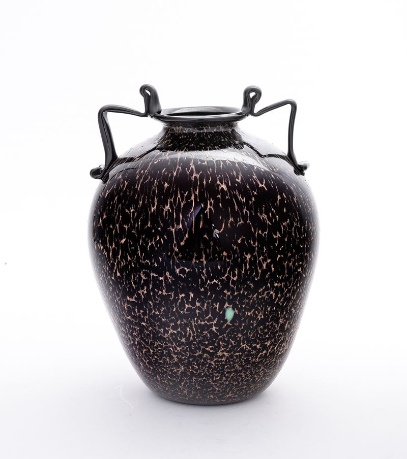Vaso ovoidale in vetro soffiato con decoro di avventurina e anse applicate.