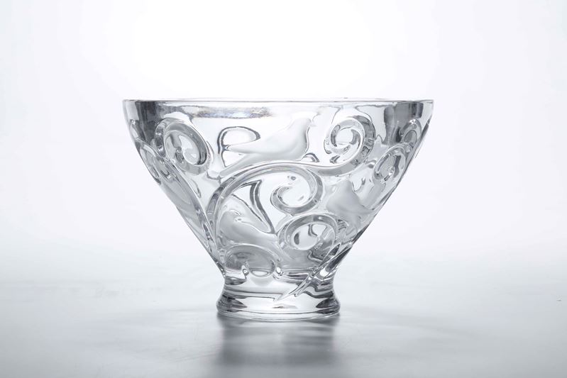 Grande coppa serie Verone in cristallo con decoro di volute e uccelli sabbiati.