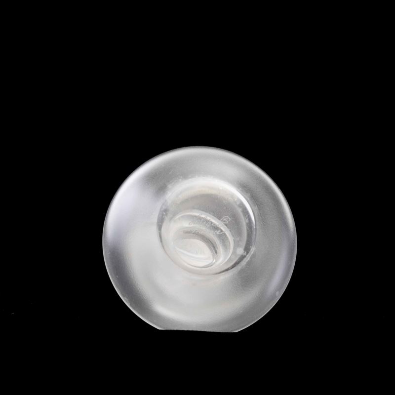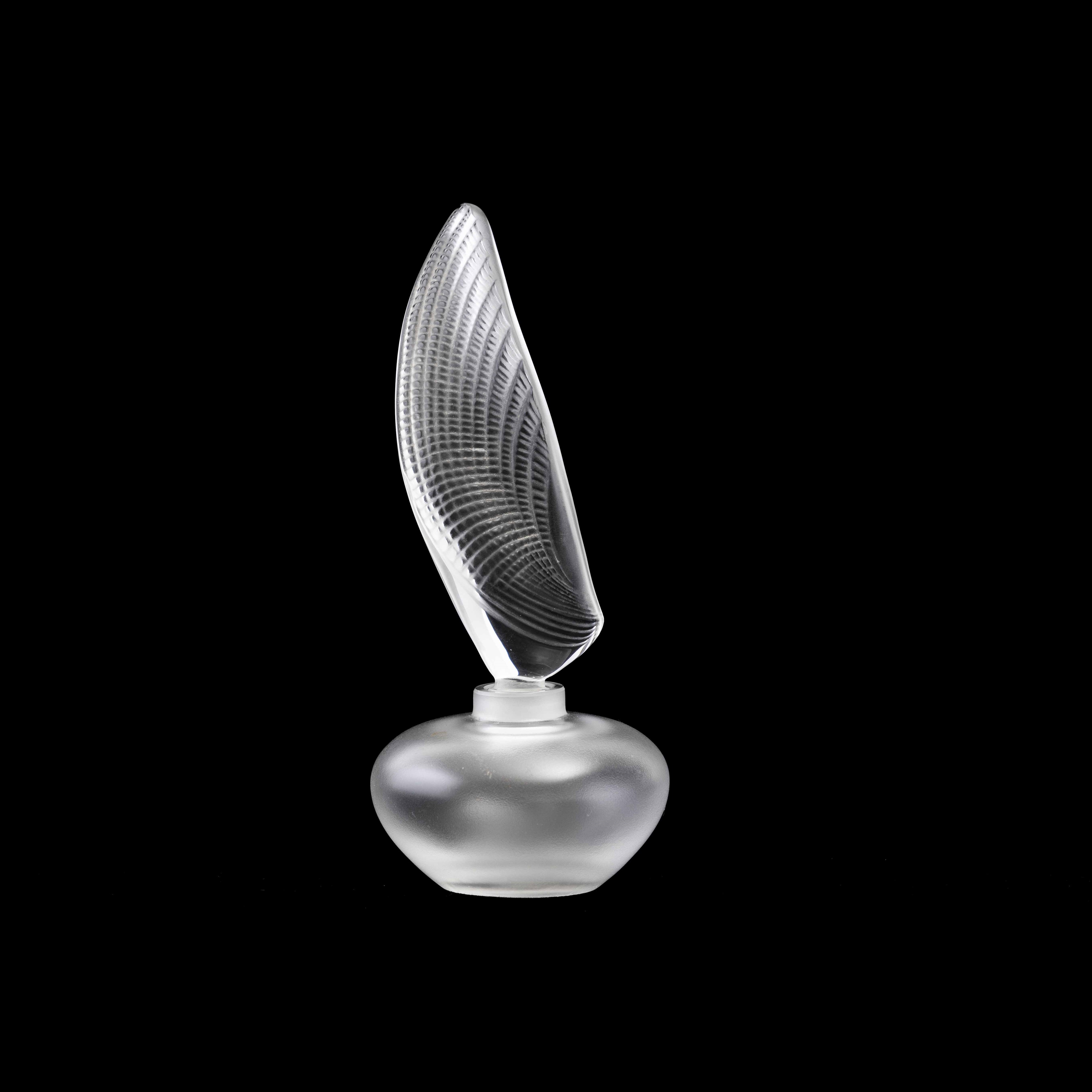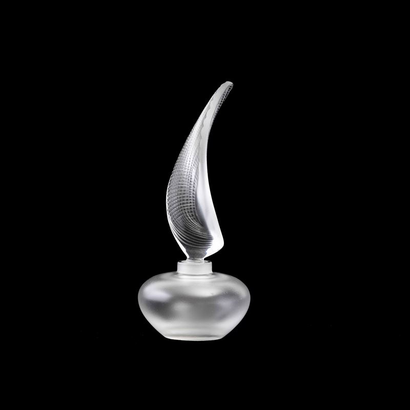 Flacone porta profumo con tappo in cristallo molato in forma di ala.