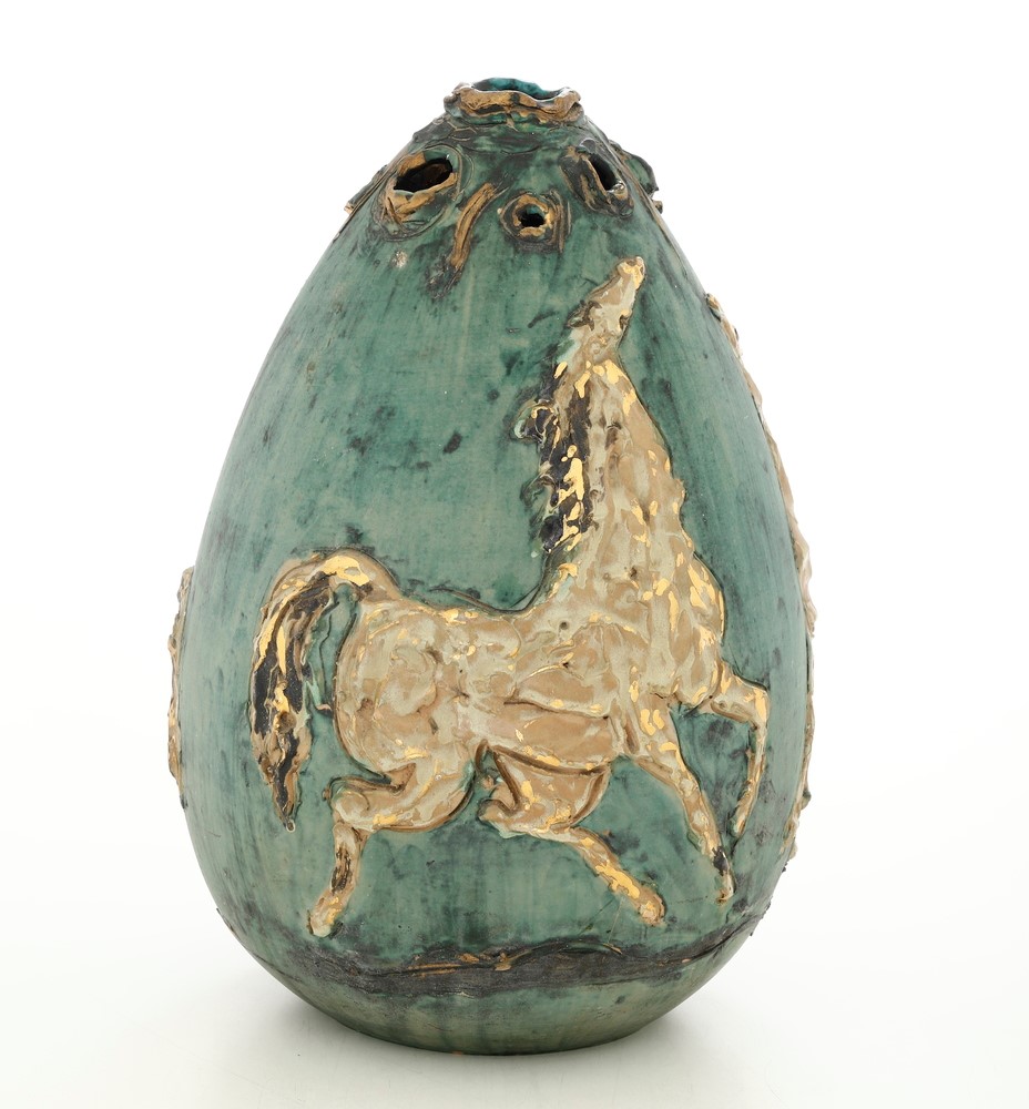 Vaso a goccia in terracotta maiolicata con decoro di cavalli in rilievo.