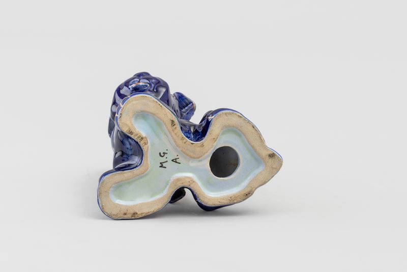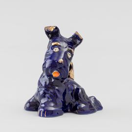 Scultura in foggia di cagnolino in terraglia a colaggio policroma con decoro in oro al terzo fuoco.
