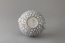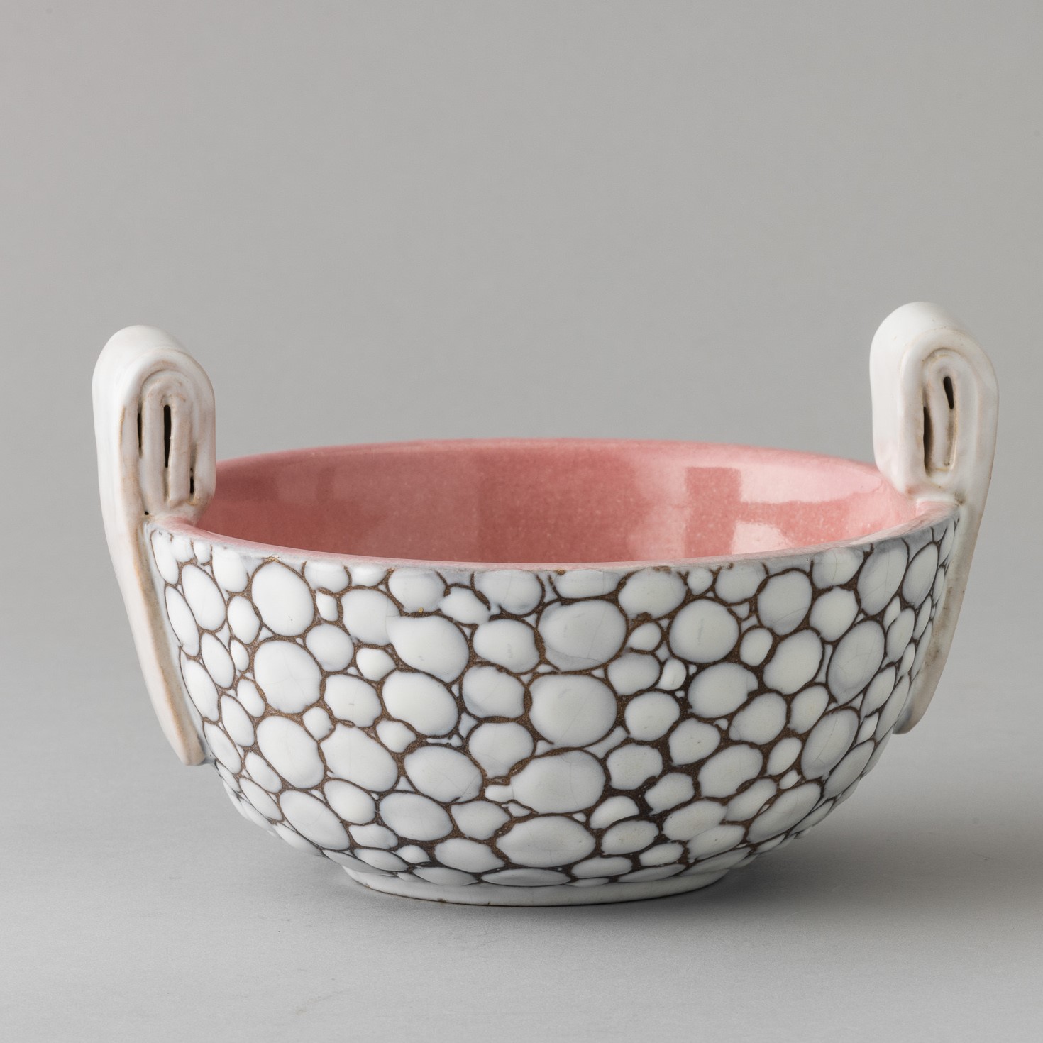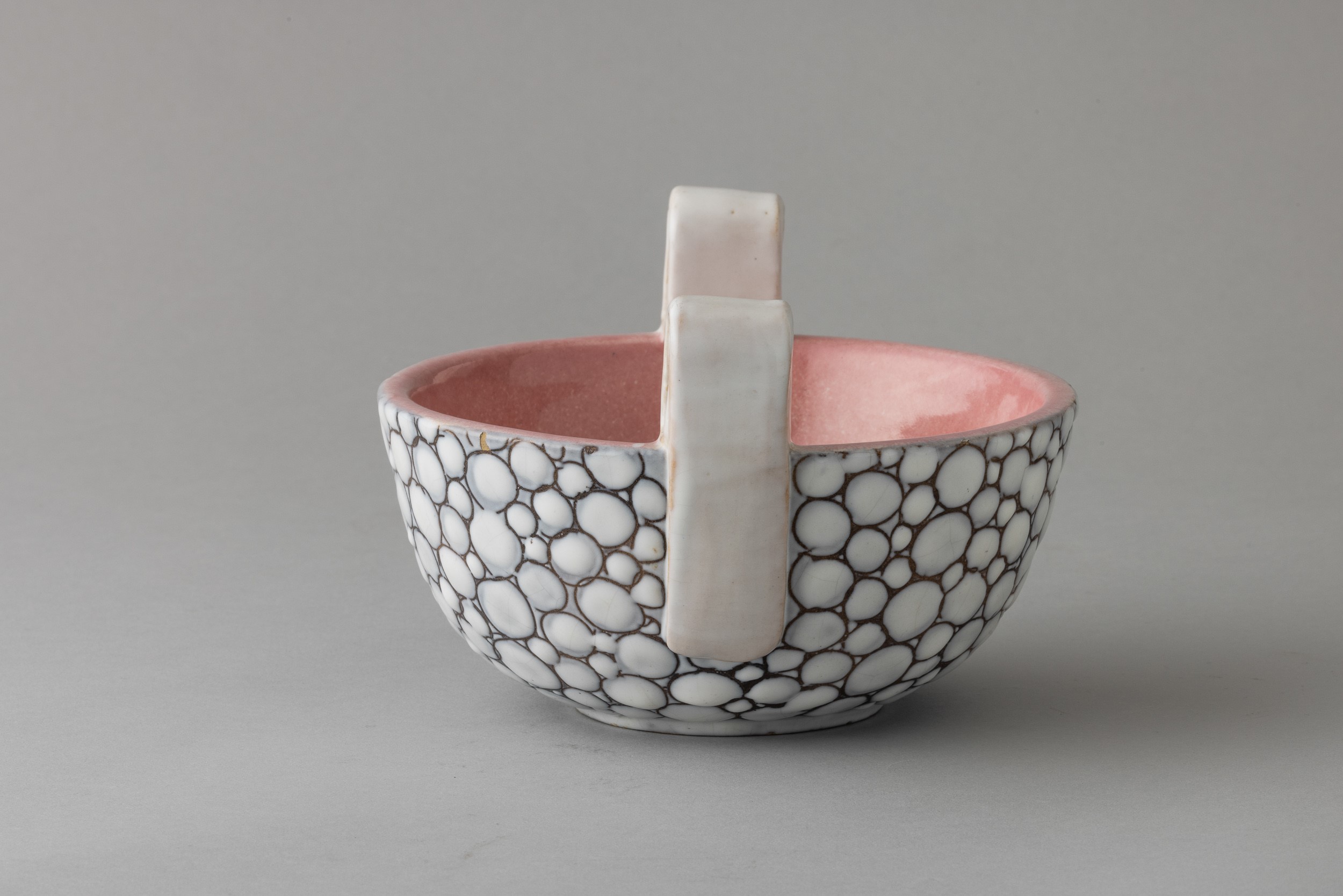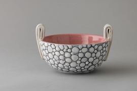 Portadolci in ceramica con anse a nastro applicate e decoro a finto ciottolato. Interno rosa.