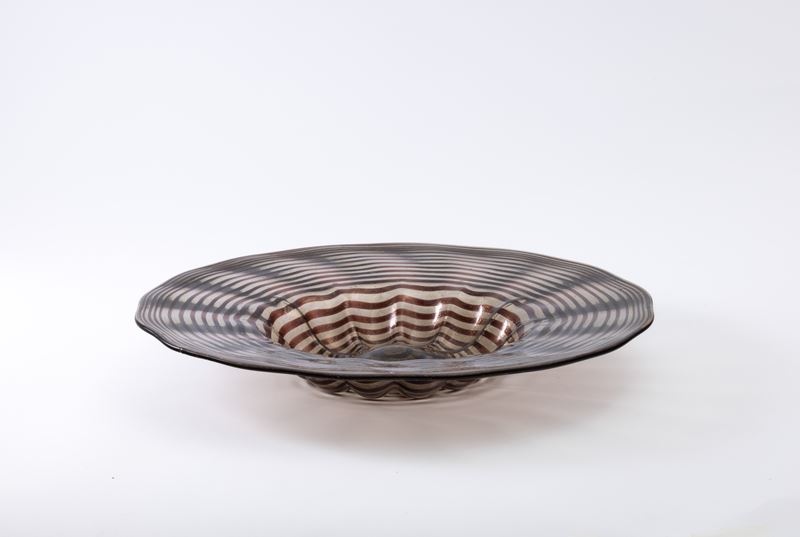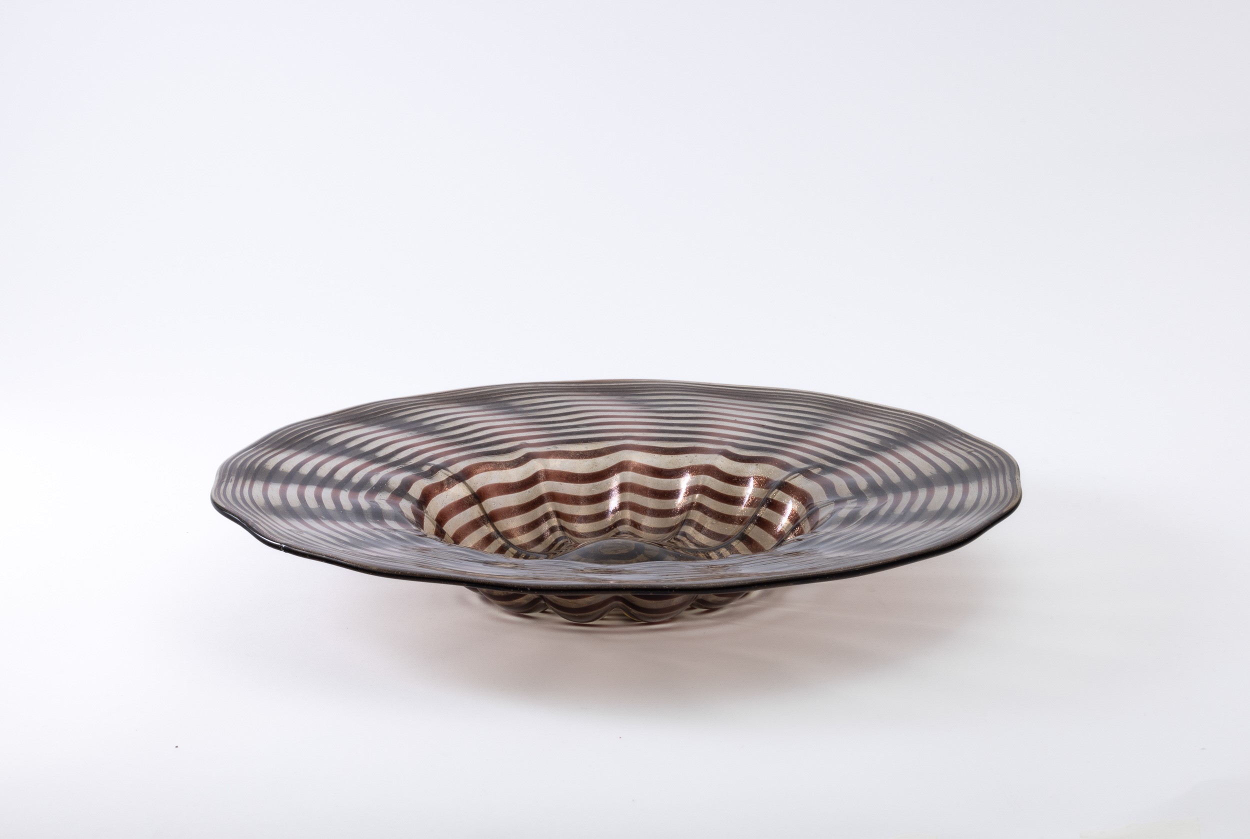 Piatto in vetro soffiato con decoro di spirale ametista e avventurina con centro baccellato.