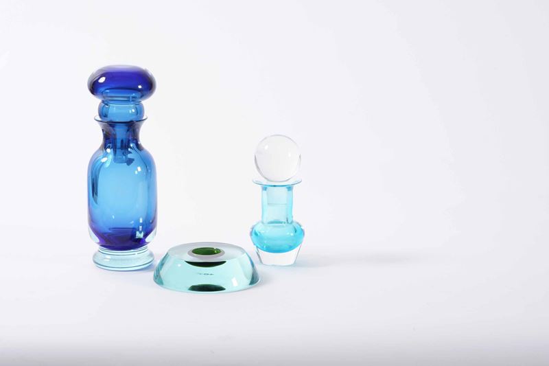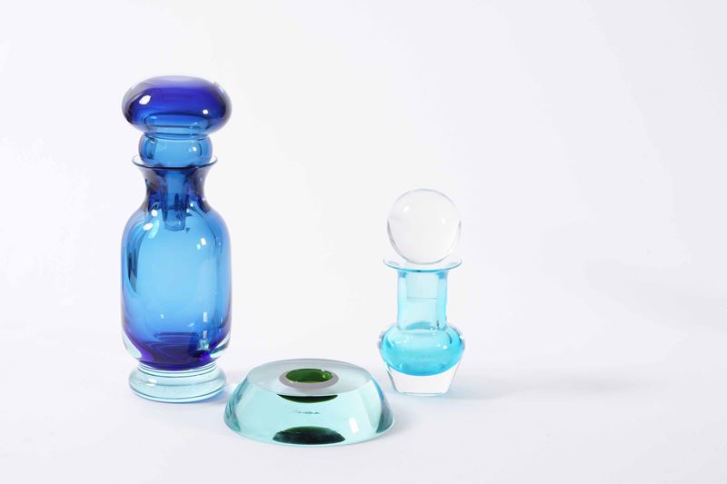Lotto formato da due vasi a bottiglia in vetro sommerso blu e turchese e uno svuotatasche.