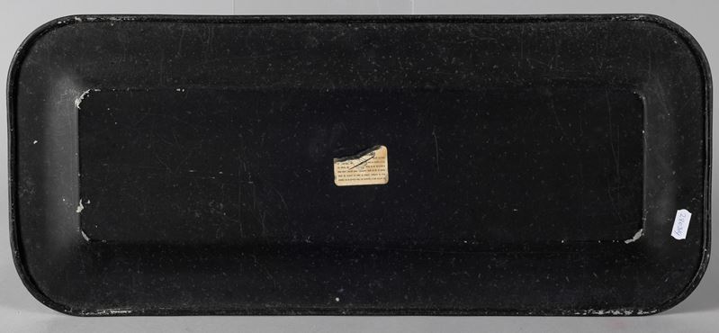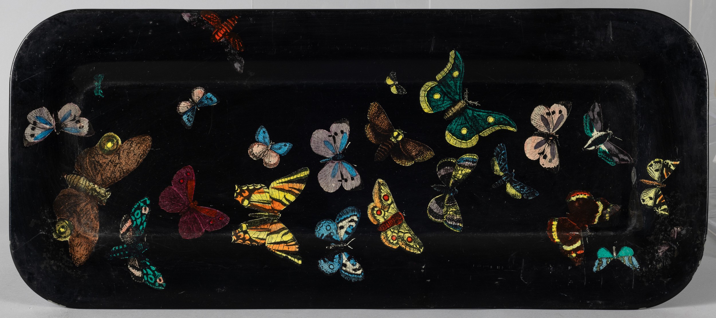 Vassoio in metallo con decoro litografato policromo di farfalle.