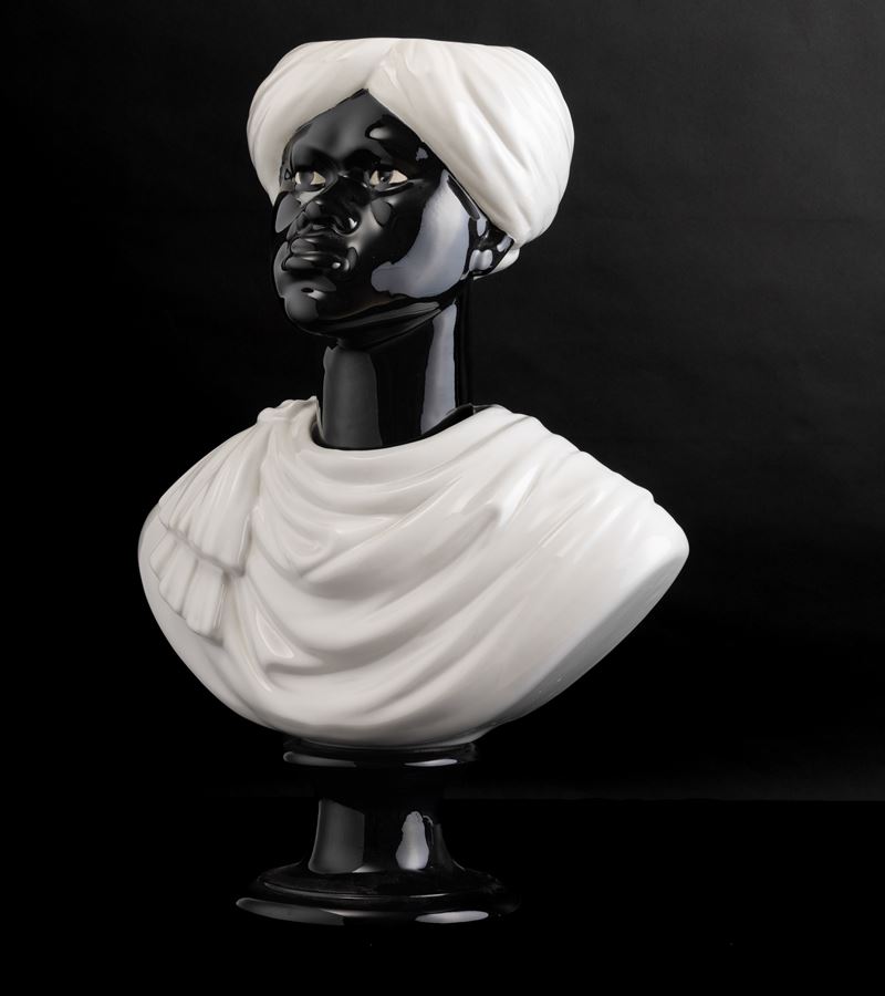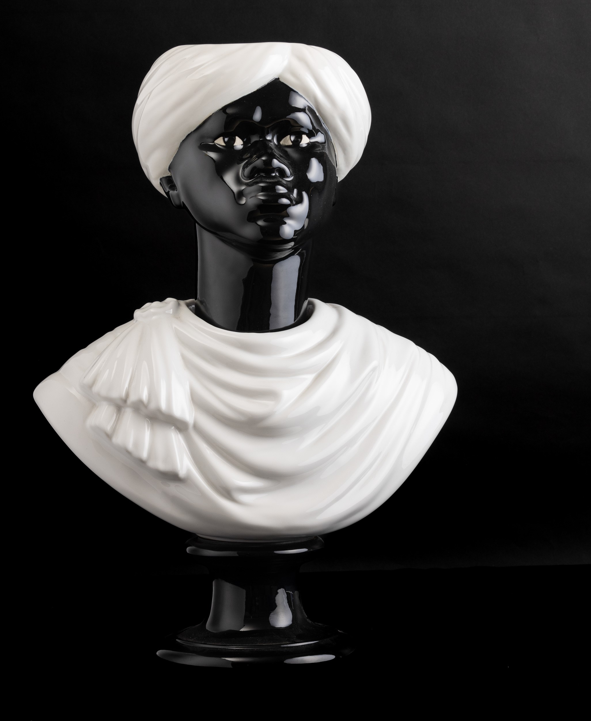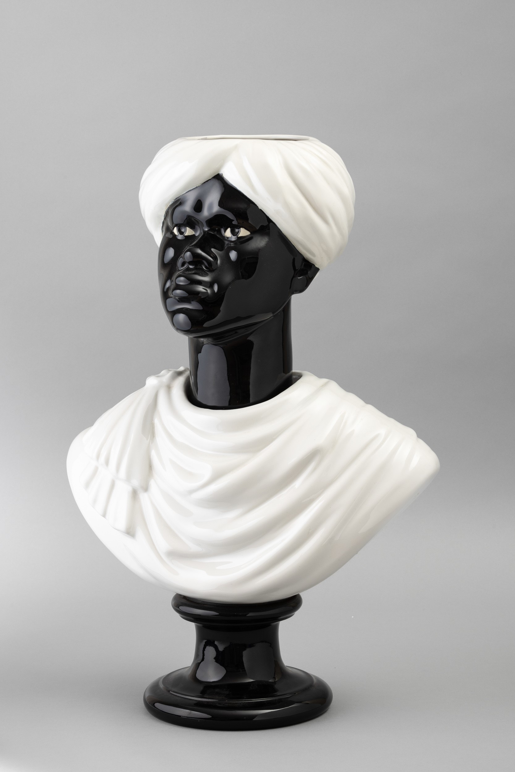 Busto di moro su basamento tornito in ceramica con decoro in smalto bianco e nero.