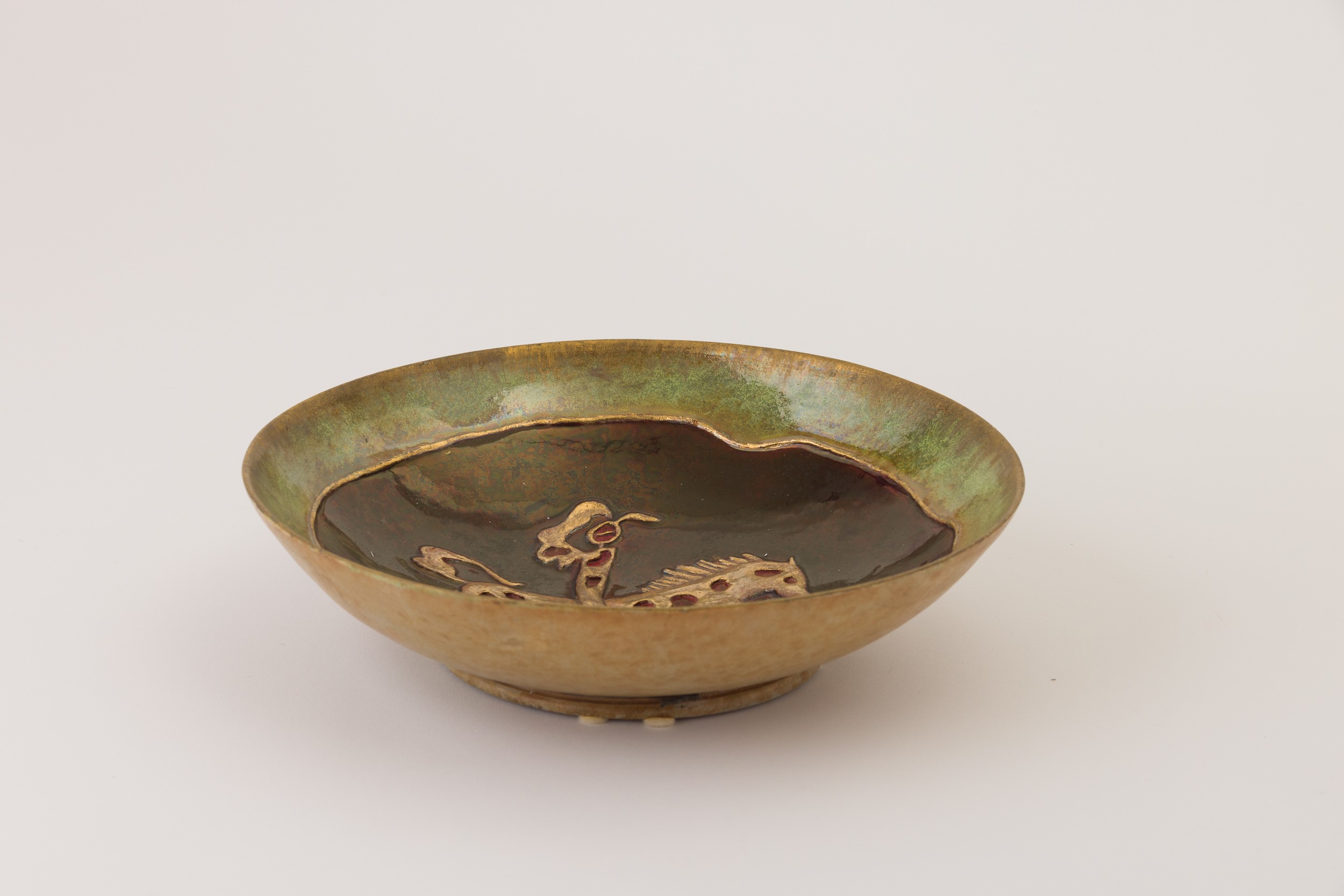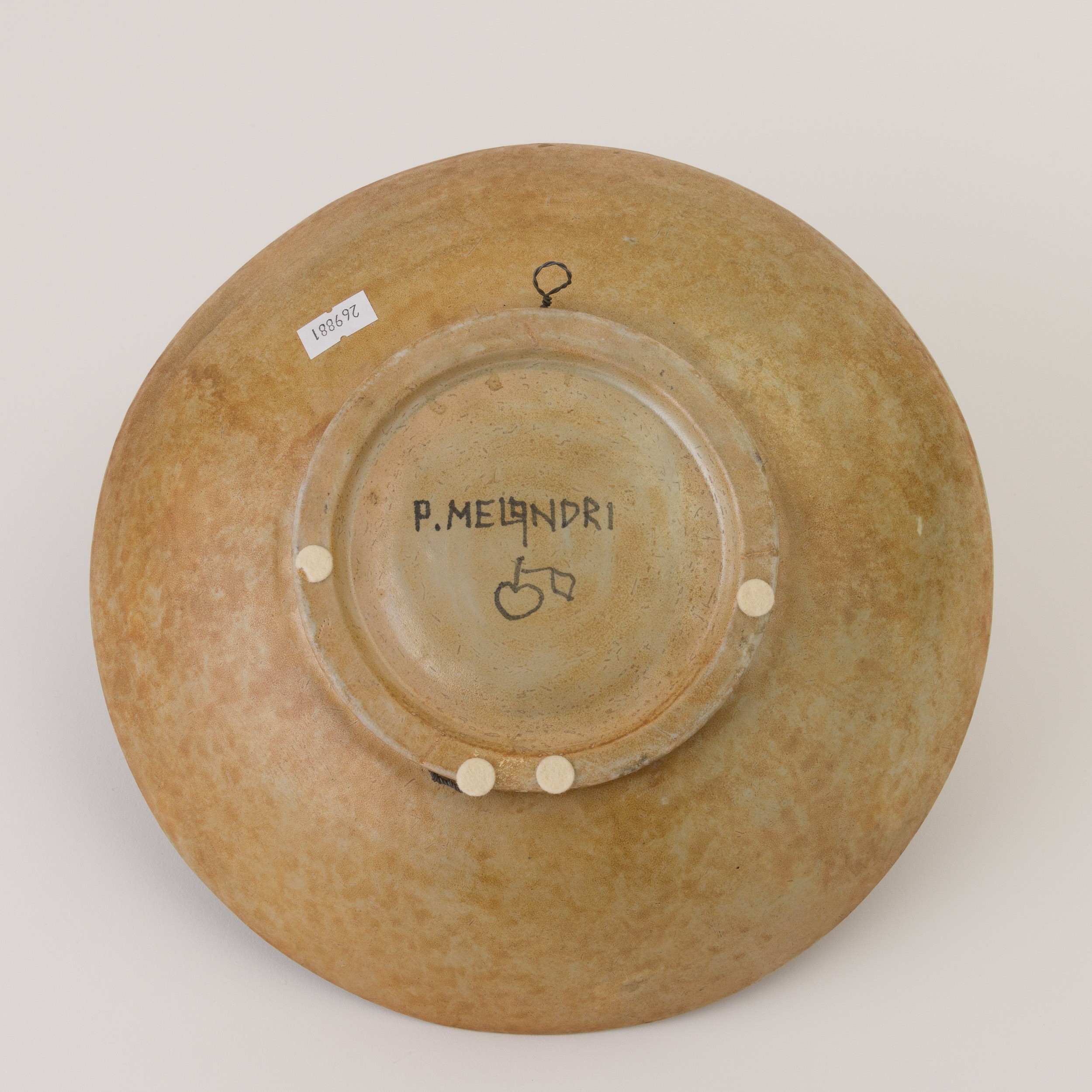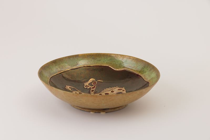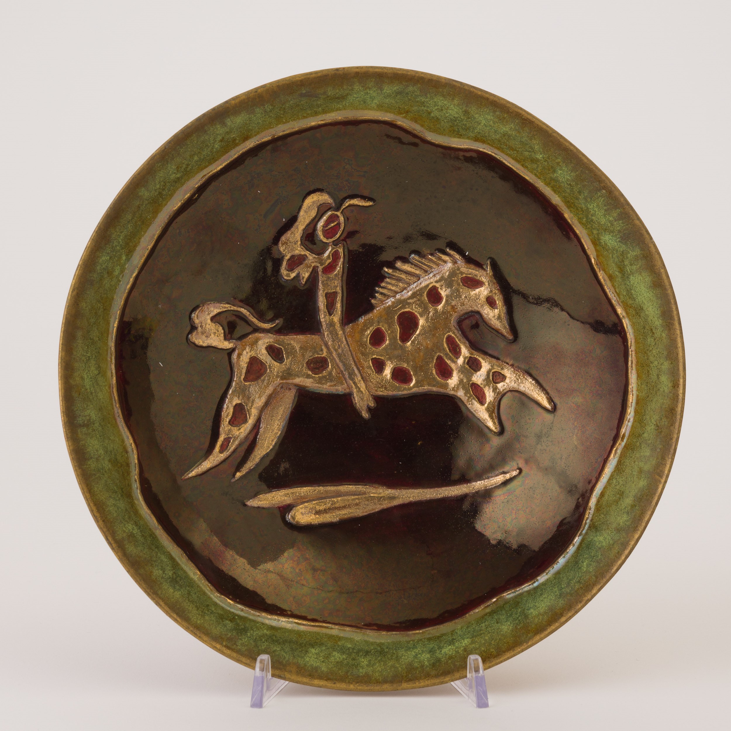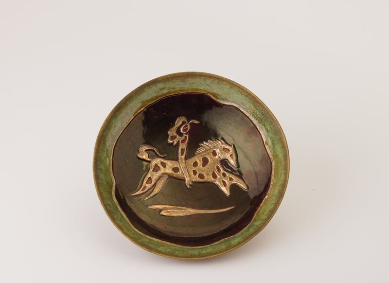 Ciotola in terracotta maiolicata decorato con figura di uomo a cavallo a rilievo in oro, su fondo vinaccia e bordo verde. Firma P. Melandri e marchio della manifattura