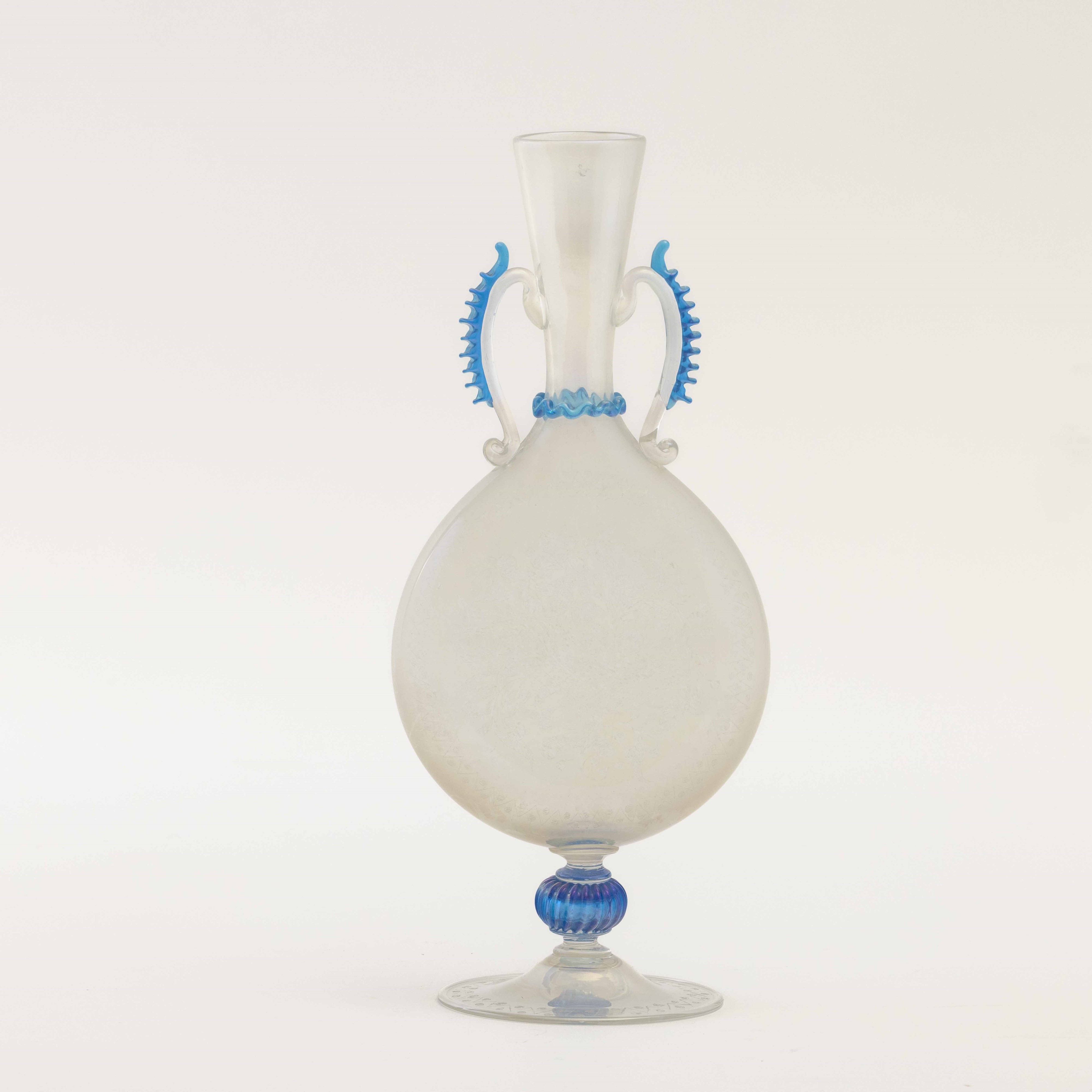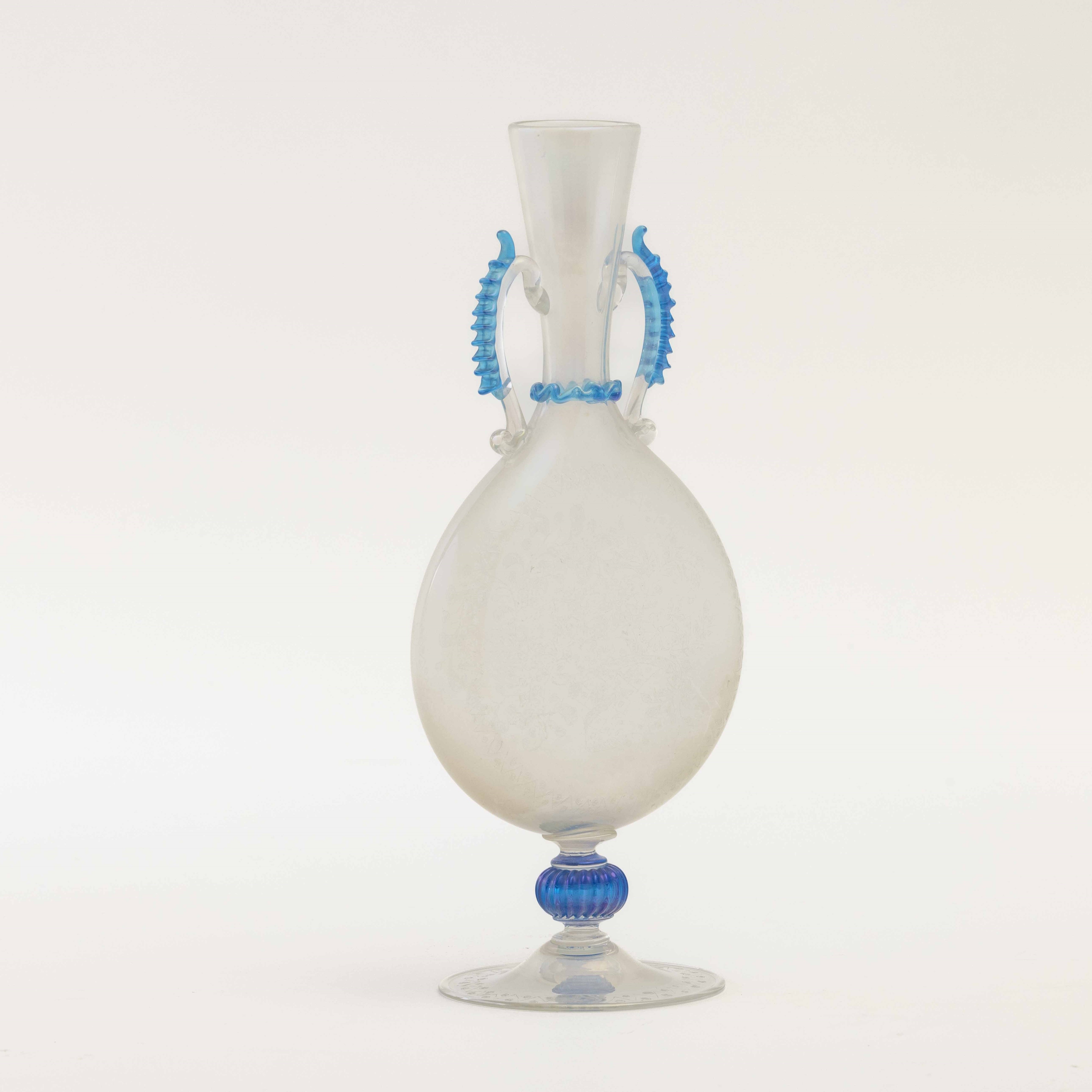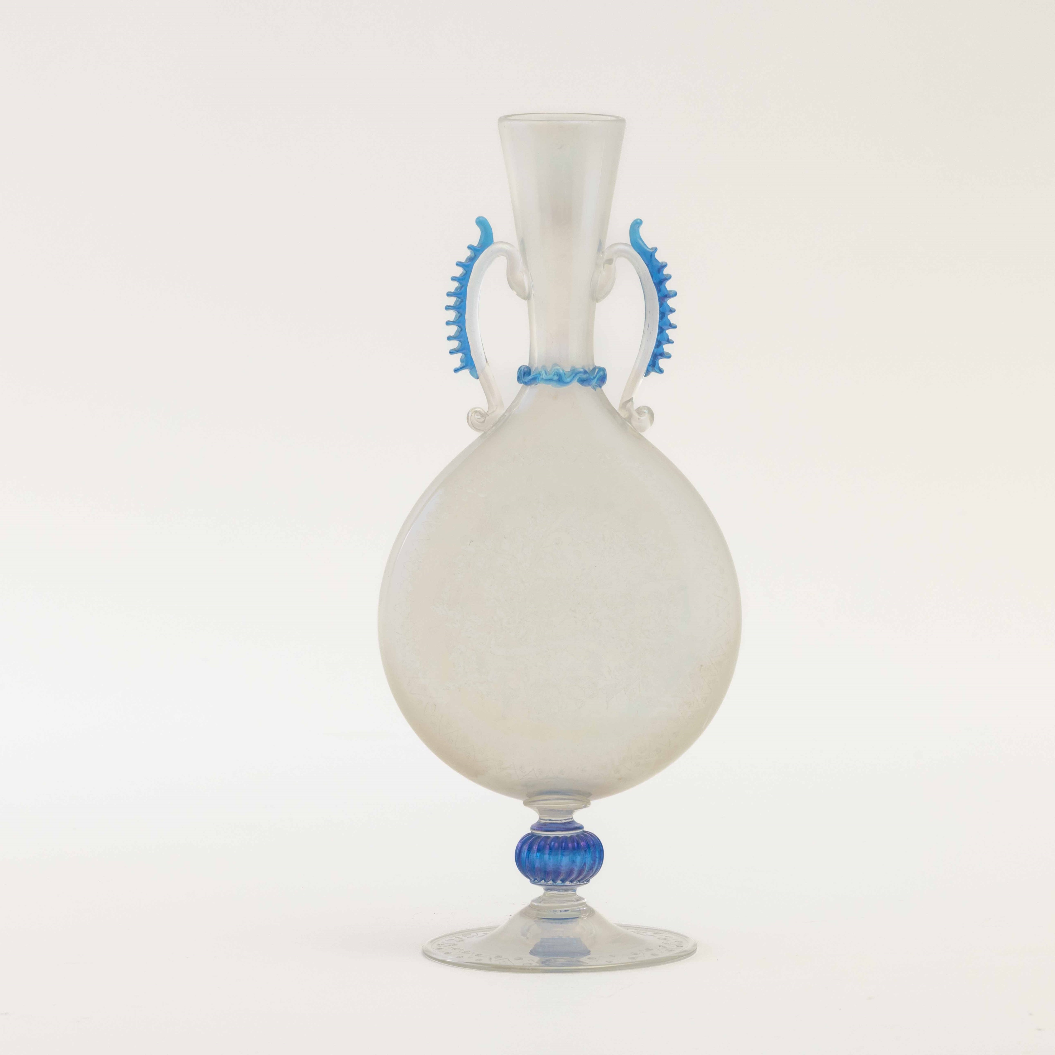Fiasca storicistica in vetro soffiato con creste applicate blu. Superficie interamente incisa alla mola e iridata.