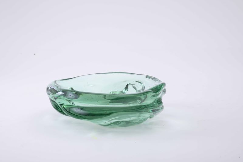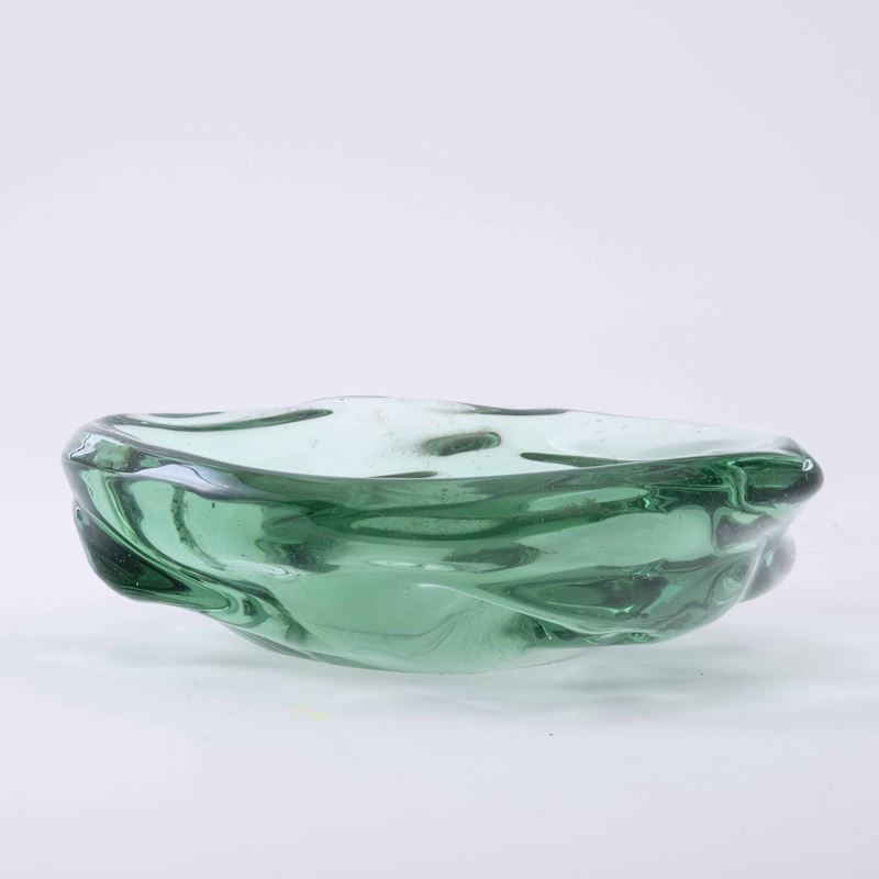 Ciotola di forma irregolare in vetro pesante sommerso colore verdino.