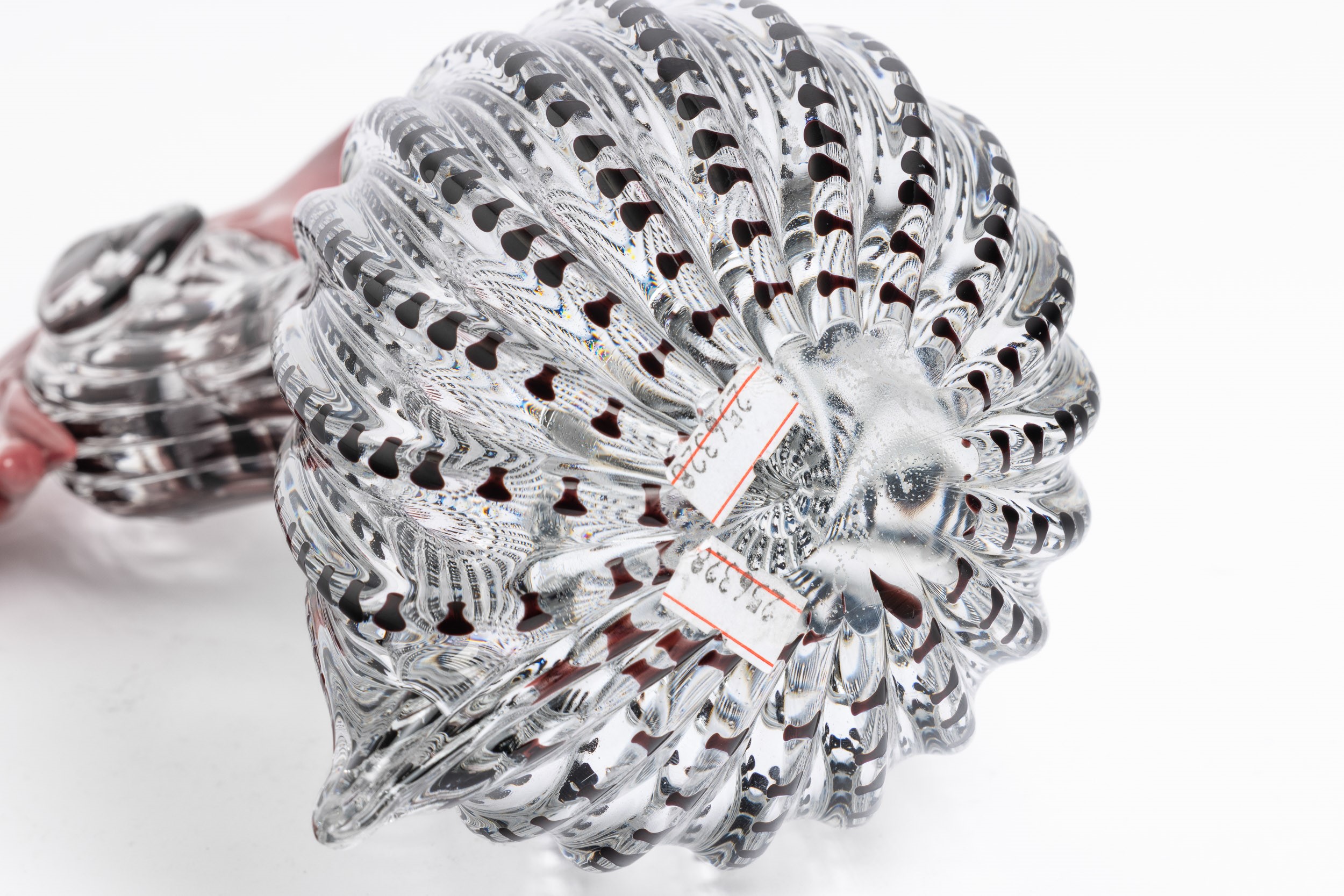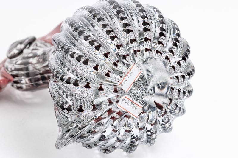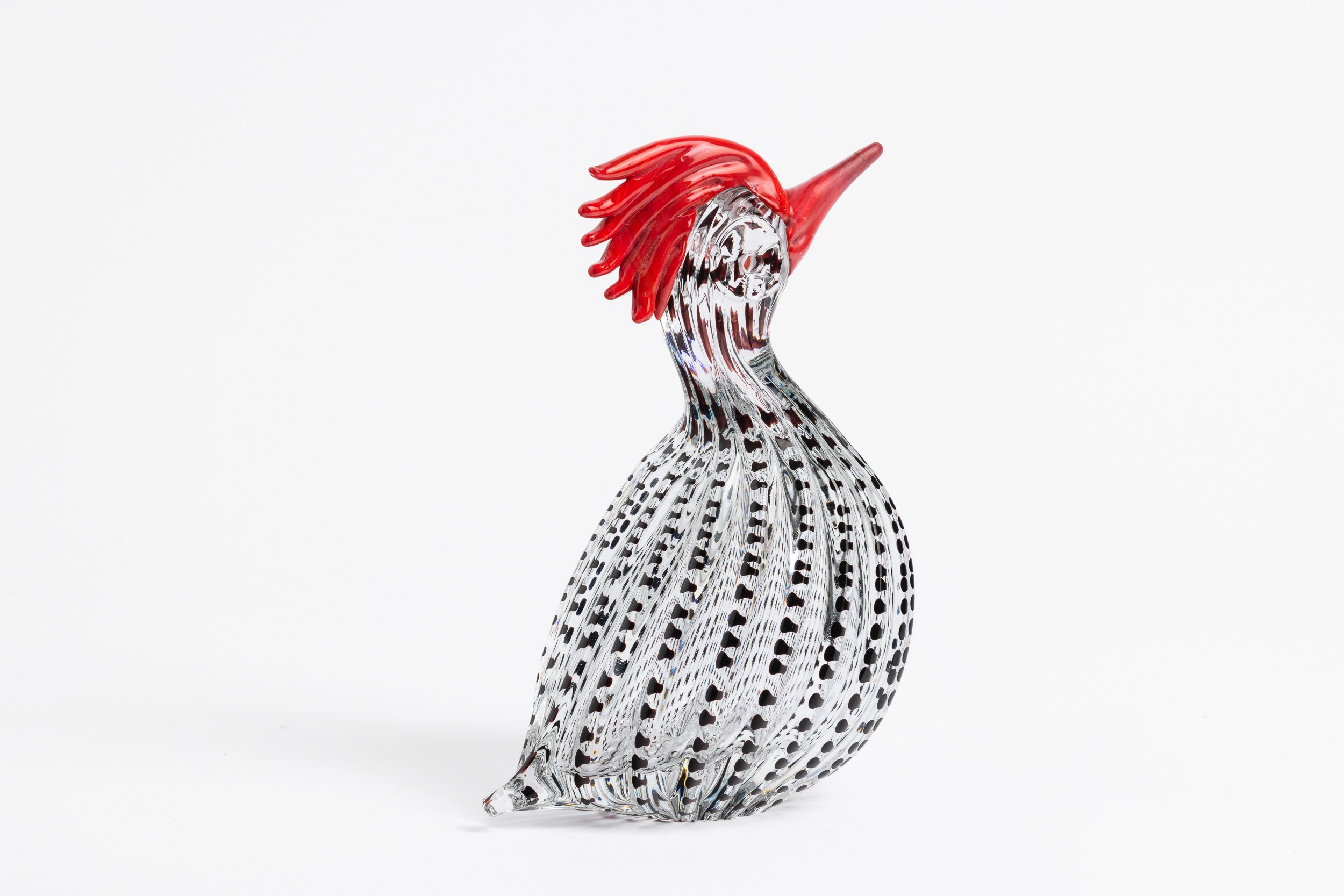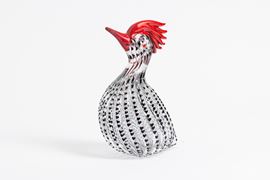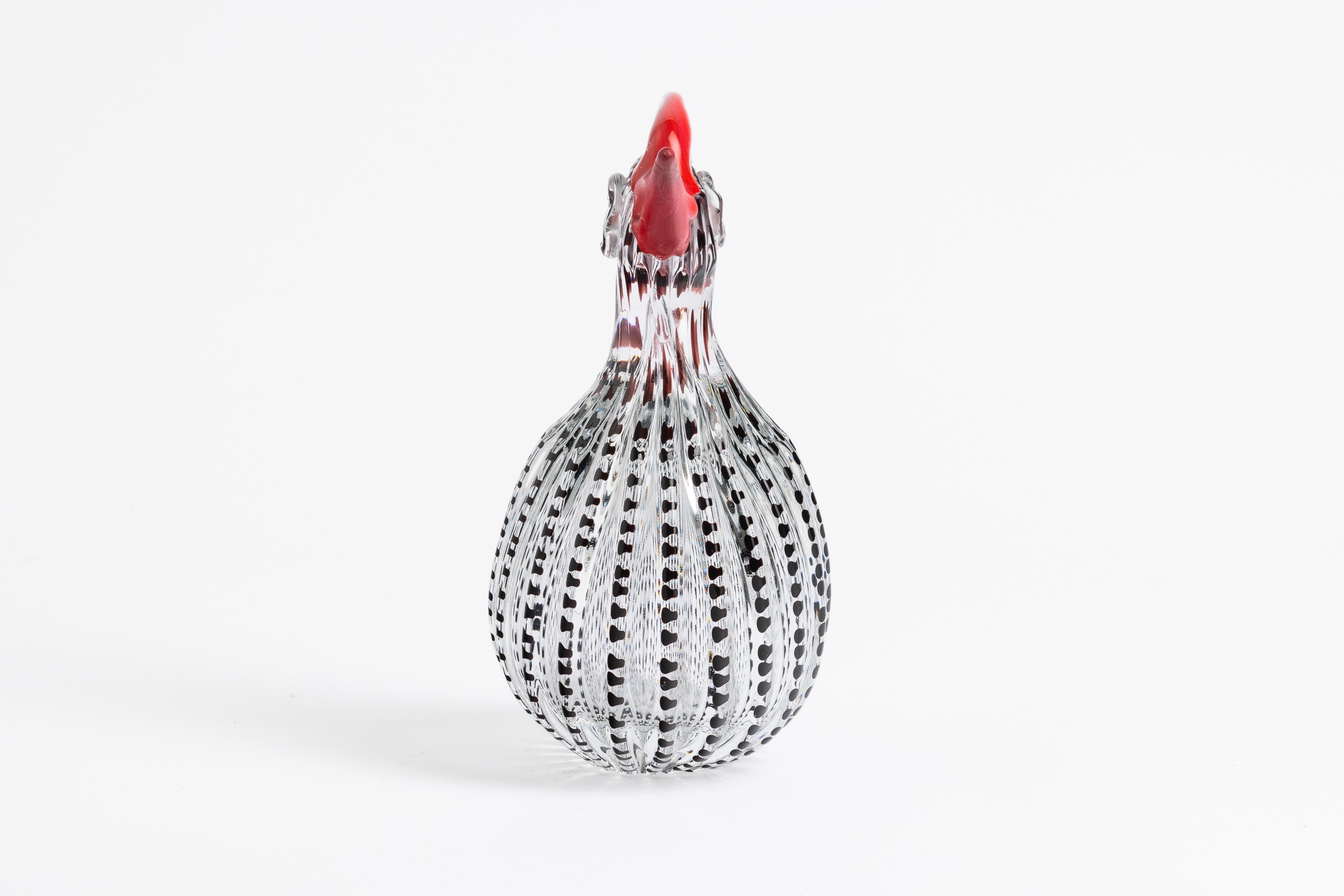 Figura di gallo in vetro con applicazioni di murrina, cresta e becco in pasta vitrea rossa.
