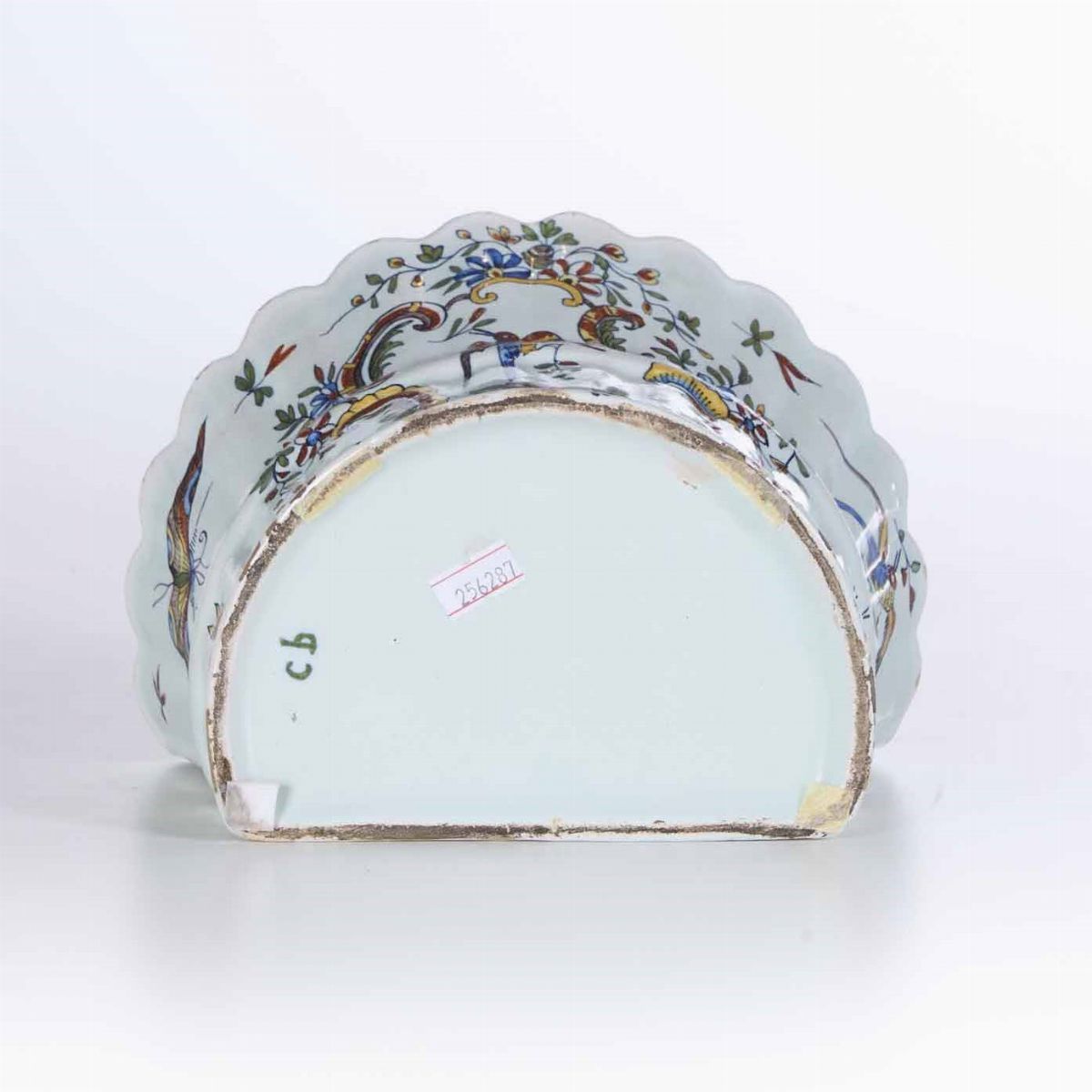 Fioriera da parete a forma di ventaglio decorata con una grande riserva a rocaille, dalla quale fuoriescono steli fioriti e fogliati, che incornicia un uccello. Semis di fiorellini, un altro uccello, una farfalla ed un insetto occupano il resto della superficie