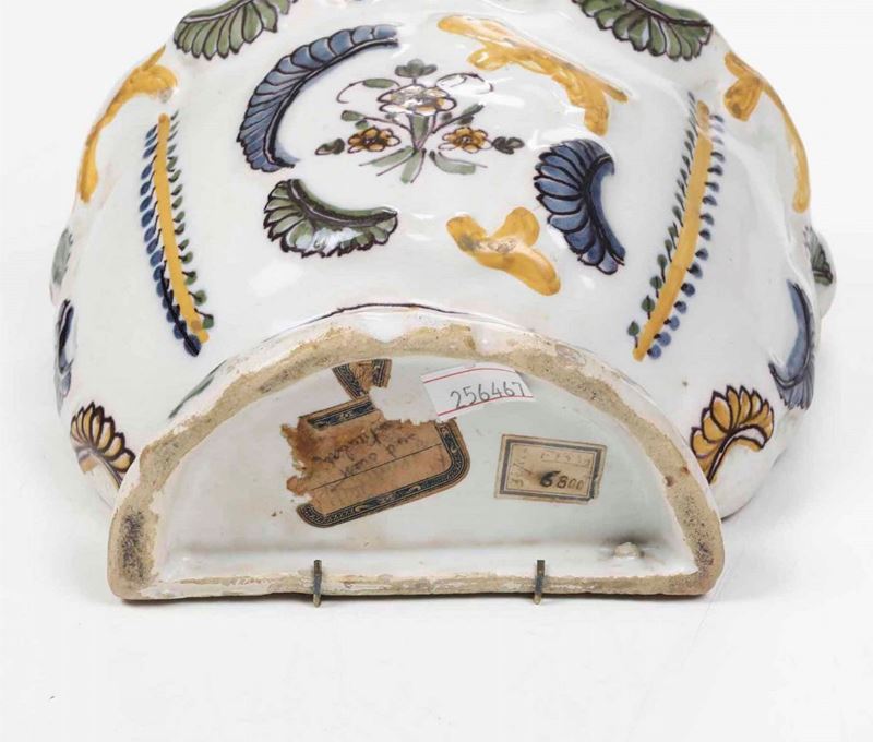 Maiolica policroma a gran fuoco. Marca: assente. Dimensioni: altezza cm 14,6; cm 18x9. Conservazione: minimi salti di smalto ai bordi