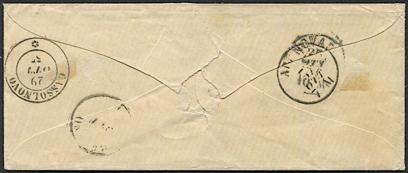 che in questa località si recava per soggiorni di piacere presso la Nobile famiglia Arconati. Affrancata con 20 cent. di Sardegna, al verso bolli di transito di Arona, Novara e di arrivo a Cassolnovo del 29 Ottobre. Rara, in perfetto stato.