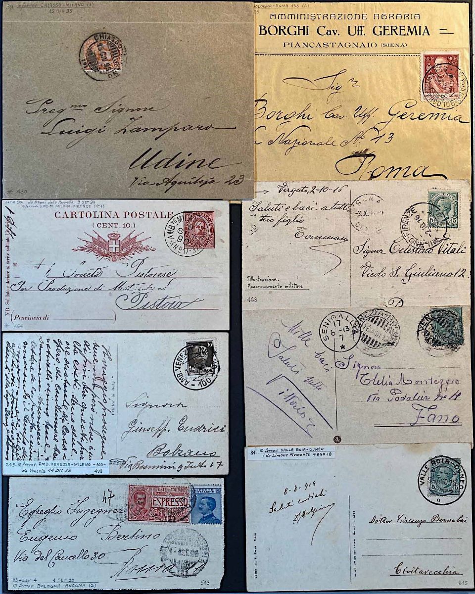 Circa 220 cartoline e qualche busta recanti bolli ferroviari o lacuali, quasi tutte diverse. Interessante collezione di diverse linee italiane, alcune rare presenze. Merita attento esame, ottima qualità.