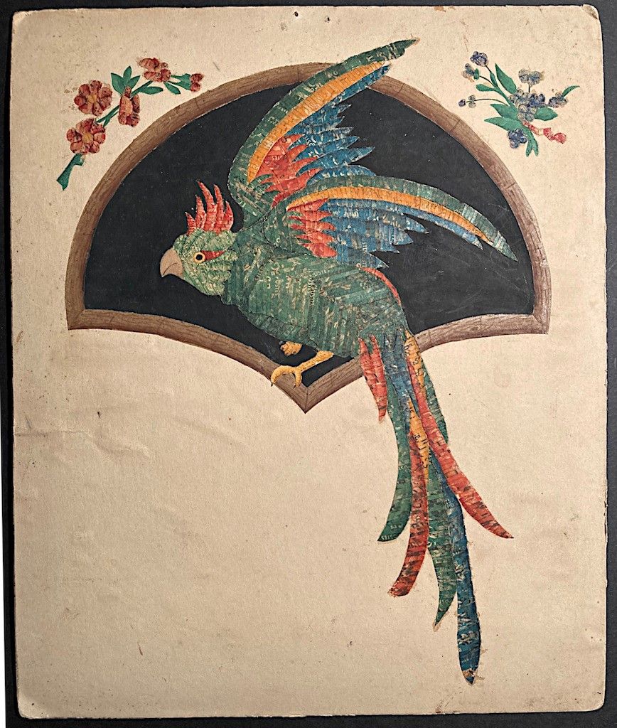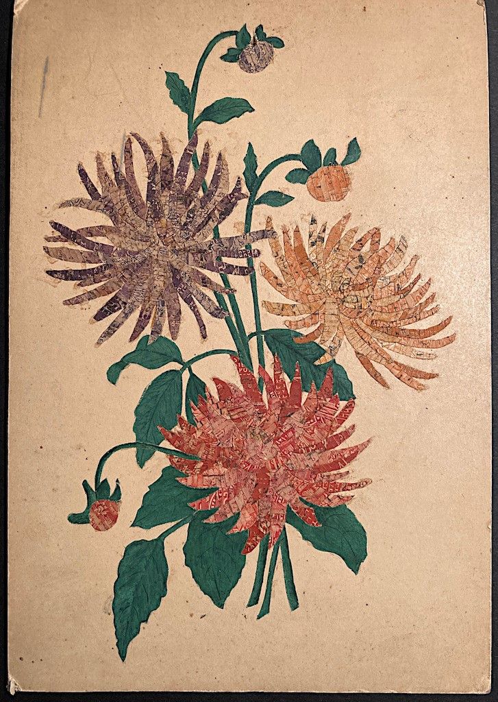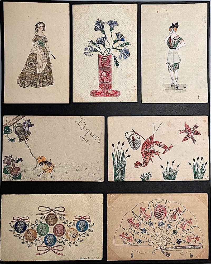 composti in mosaico da piccoli frammenti di francobolli minuziosamente applicati in composizioni che riguardano soggetti orientali, fiori, farfalle, paesaggi, animali, ecc. Qualche cartolina viaggiata, in gran parte nuove. Straordinaria raccolta di una Autrice francese, di grande effetto e raffinato ingegno.
