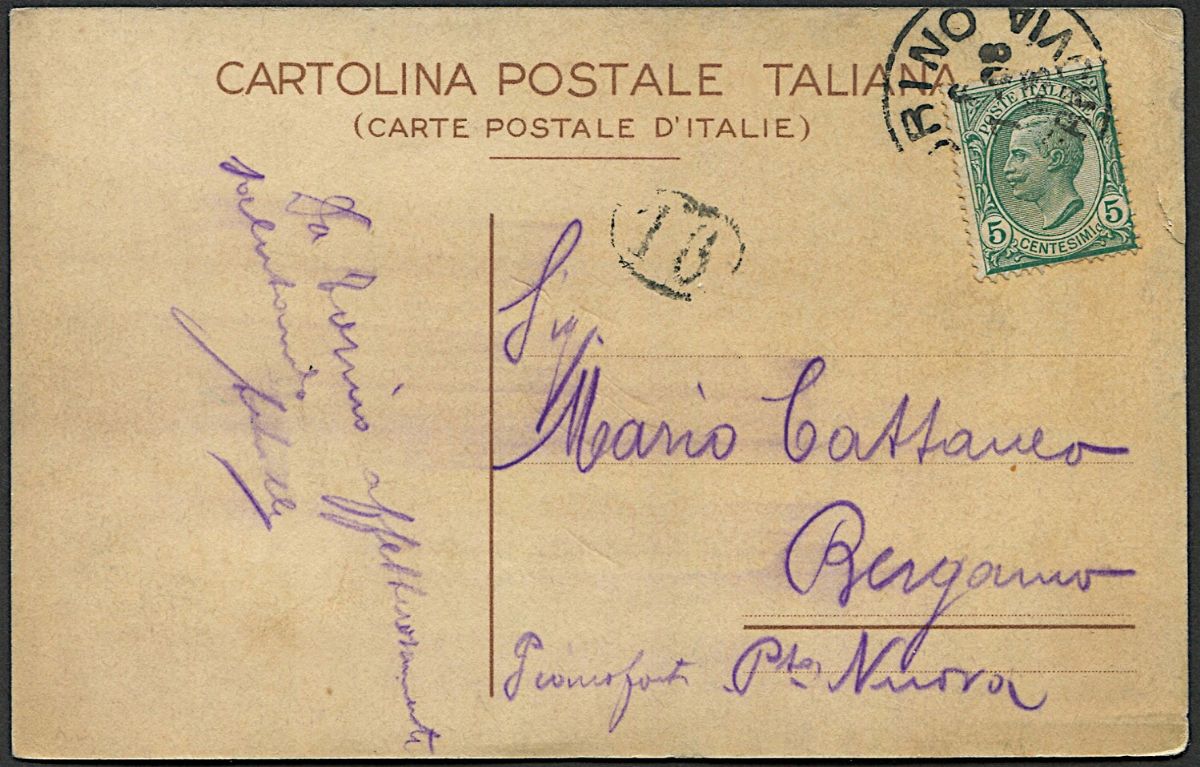 Da Torino per Bergamo del 6 luglio 1908. Tracce da inchiostro di timbrature al recto, una trentina di cartoline note. Rara. (Longhi 08DXb).