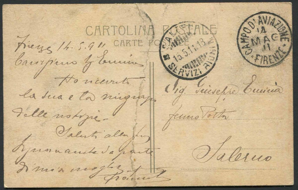 affrancata al recto con 2 esemplari del 5 cent. "Leoni" e vignetta speciale, annullati col bollo "Campo di Aviazione/14 maggio 11/Firenze". Piega orizzontale che attraversa la cartolina, ma rarissima combinazione di ottimo aspetto. (Longhi 11BXa)