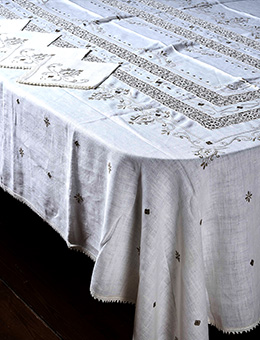 Lino con pizzo e ricami. Tovaglia cm 300x170; tovaglioli cm 42x42