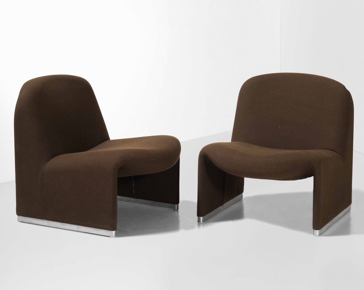 Due poltrone mod. Alky con struttura in legno e metallo cromato. Rivestimenti in tessuto.