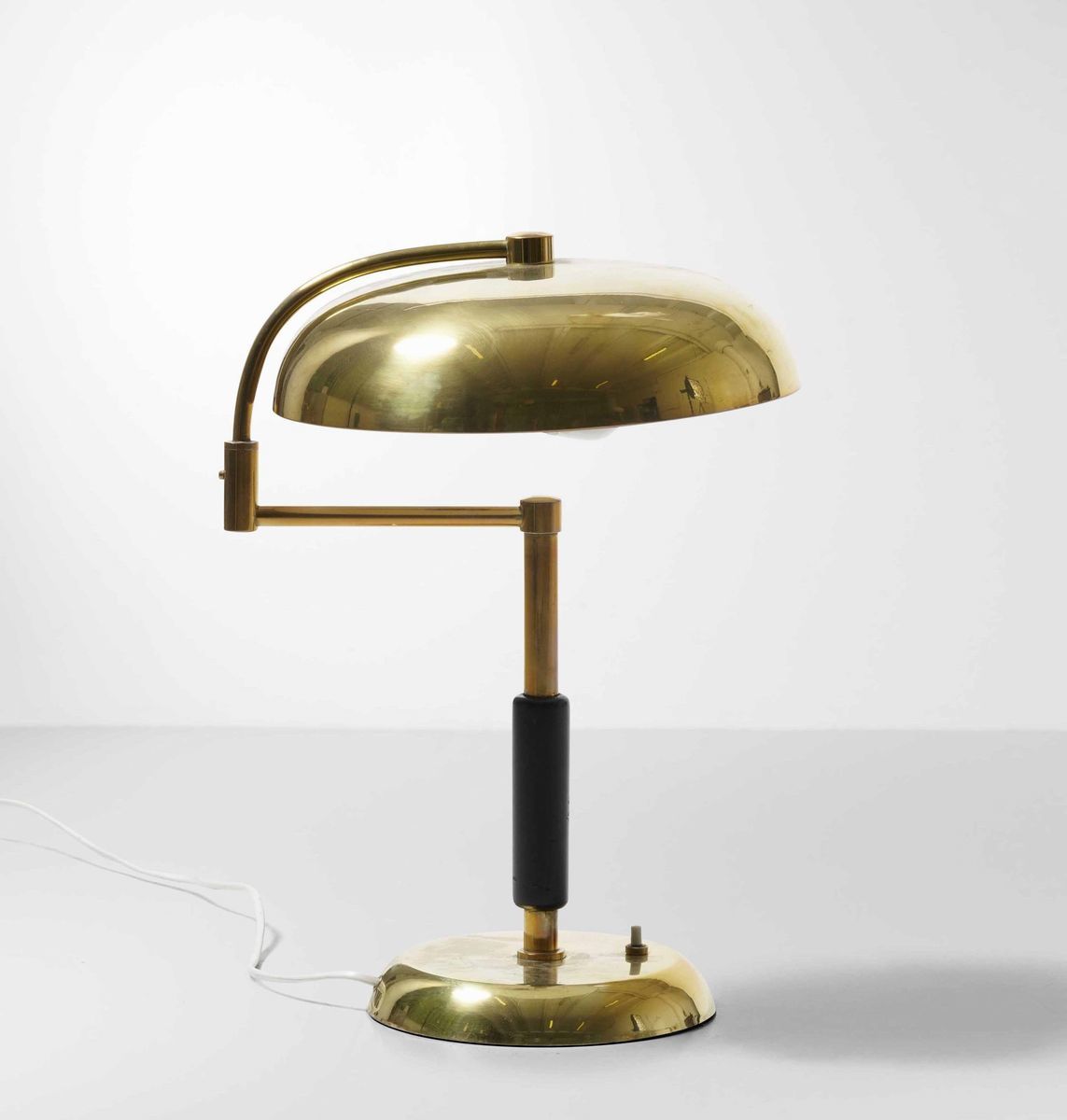 Lampada da tavolo orientabile con struttura, diffusore e base in ottone.