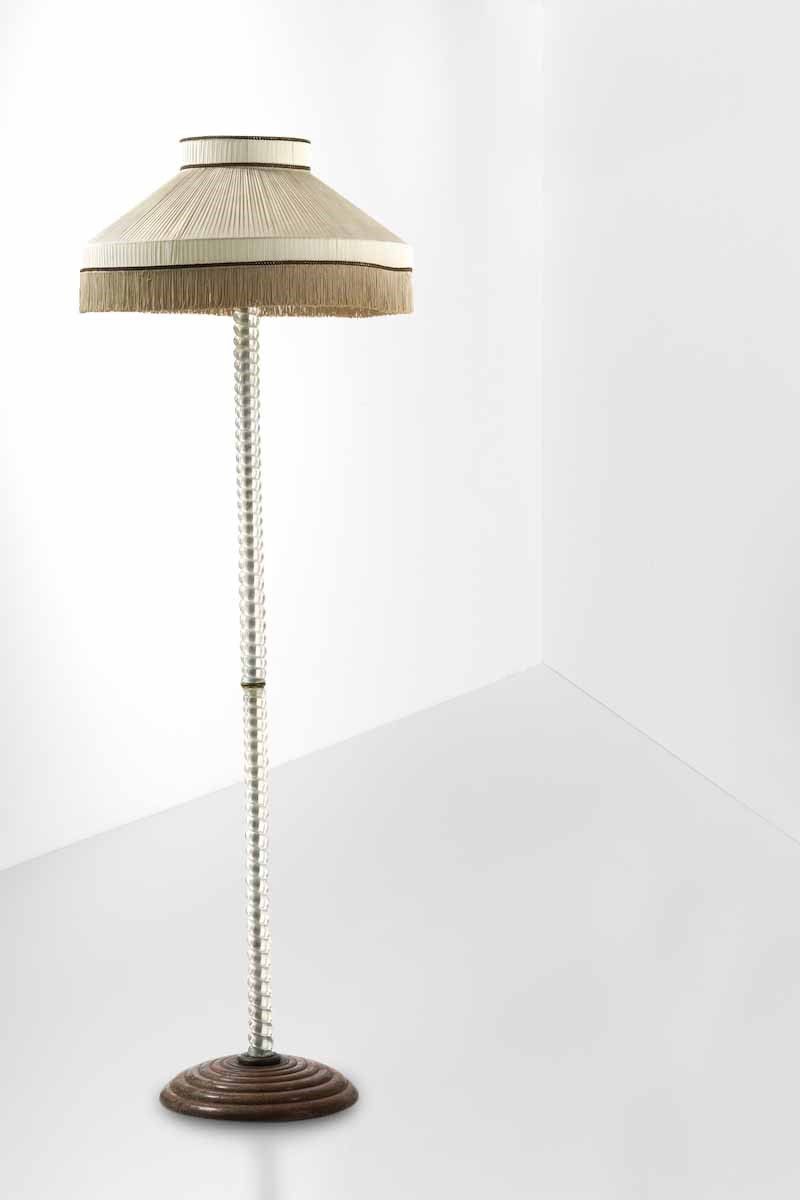 Lampada da terra con struttura in metallo e fusto in vetro di Murano. Paralume in tessuto.