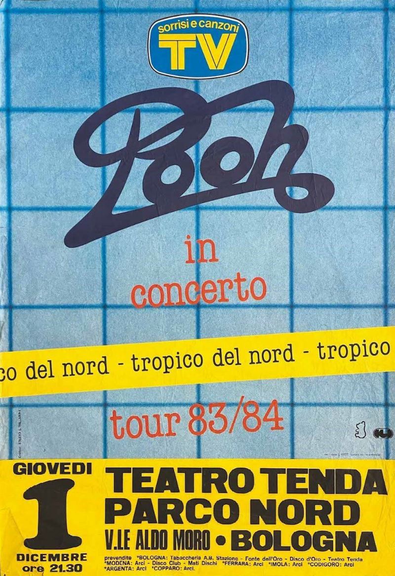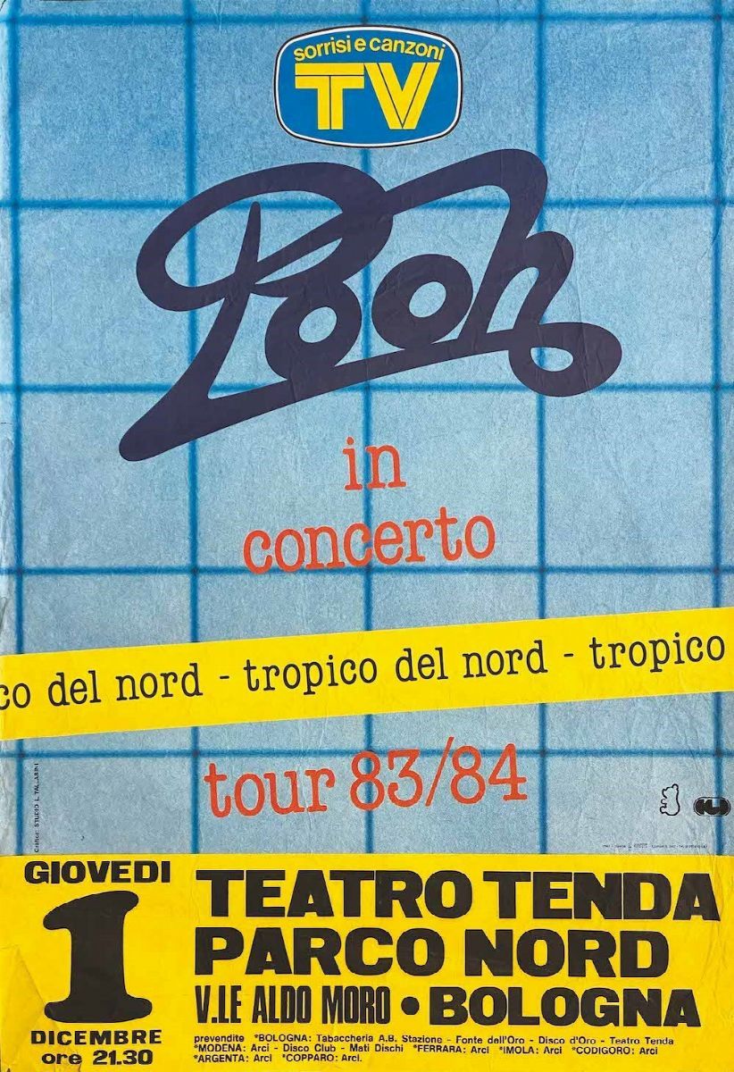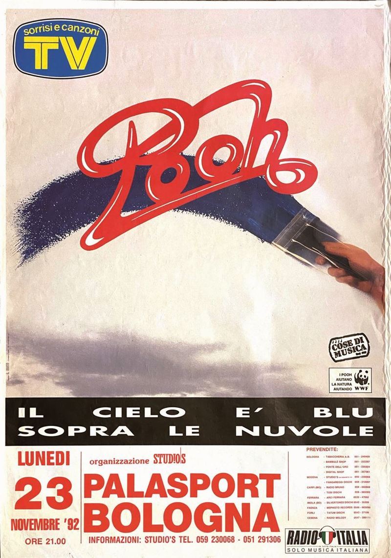 Lotto composto da 3 manifesti offset per concerti. Ciascuno cm 100x70. "Pooh Tropico del Nord", 1983-1984. Qualità B: strappi marginali senza mancanze. "25 Pooh la nostra Storia", 1990. Qualità B. "Pooh Il cielo è blu sopra le nuvole", 1992. Qualità A-.