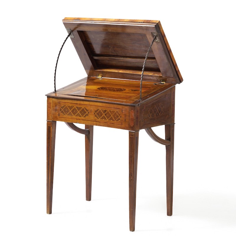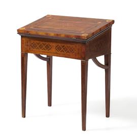 Tavolo lastronato e filettato, intarsiato a motivi geometrici. XVIII-XIX secolo