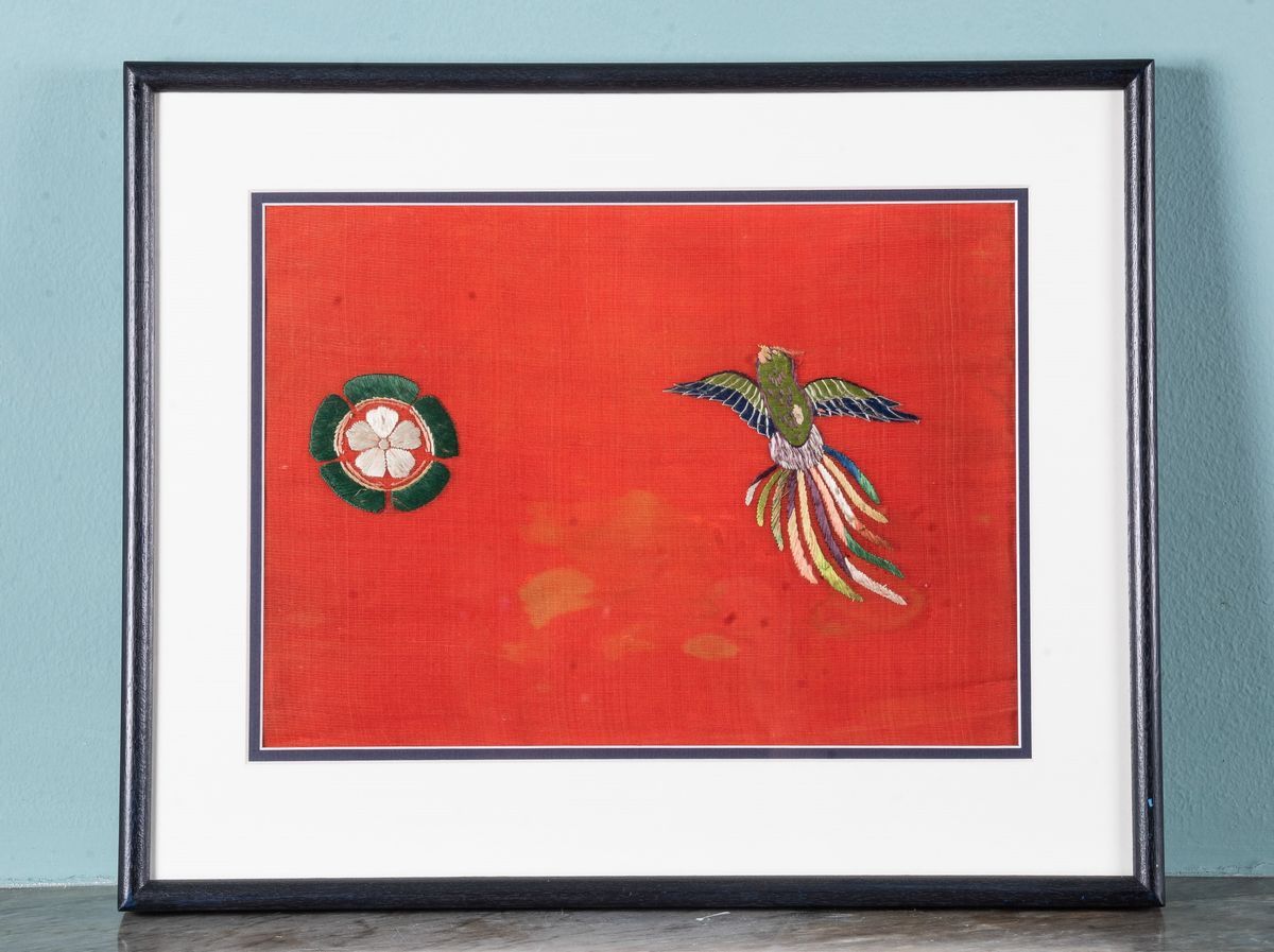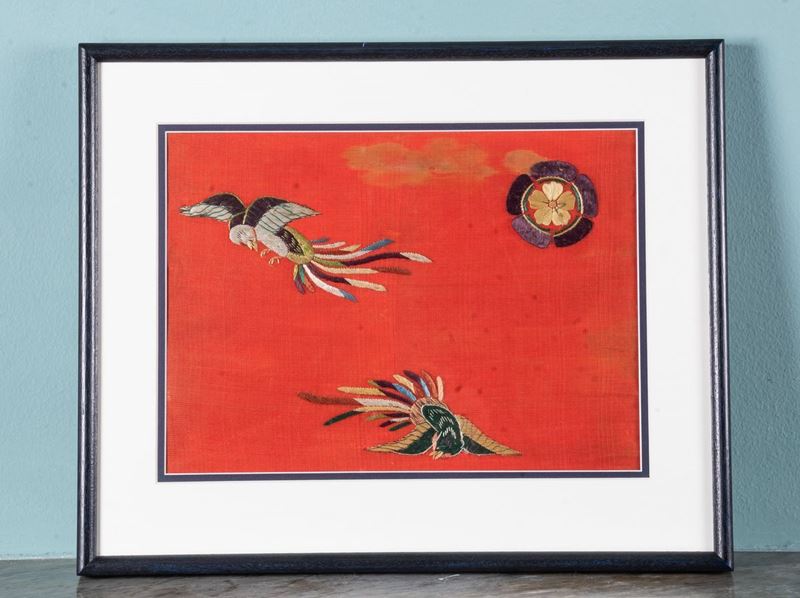 Seta ricamata con figure di fenici e decori floreali