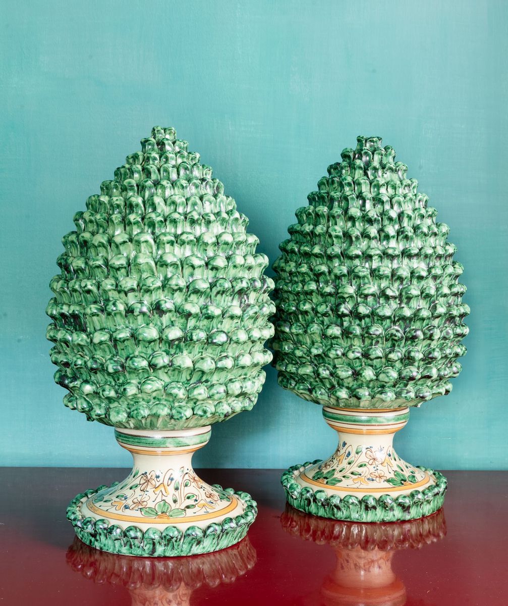 La pigna artistica in ceramica è un ornamento che, secondo l’antica tradizione popolare siciliana, rappresenta un simbolo di buon auspicio che non può mancare in una casa. Spesso regalata in occasione delle nozze può essere posta nella camera da letto (fecondità), sui balconi o all’ingresso delle abitazioni (fortuna, prosperità, salute)