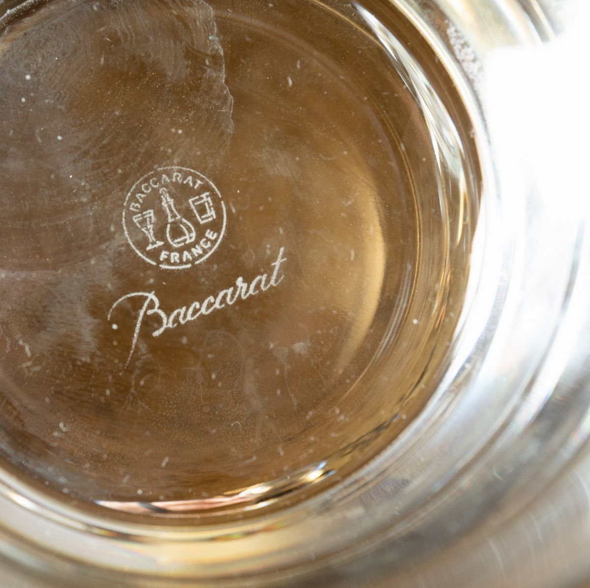 Bicchieri whisky. Marca: simbolo grafico della manifattura con “Baccarat France” e “Baccarat” inciso all’acido. Altezza cm 10,6. Conservazione: ottima