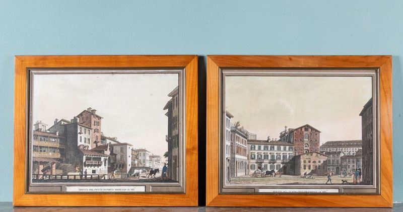 Gruppo di cinque incisioni acquerellate con vedute di Milano. XIX secolo