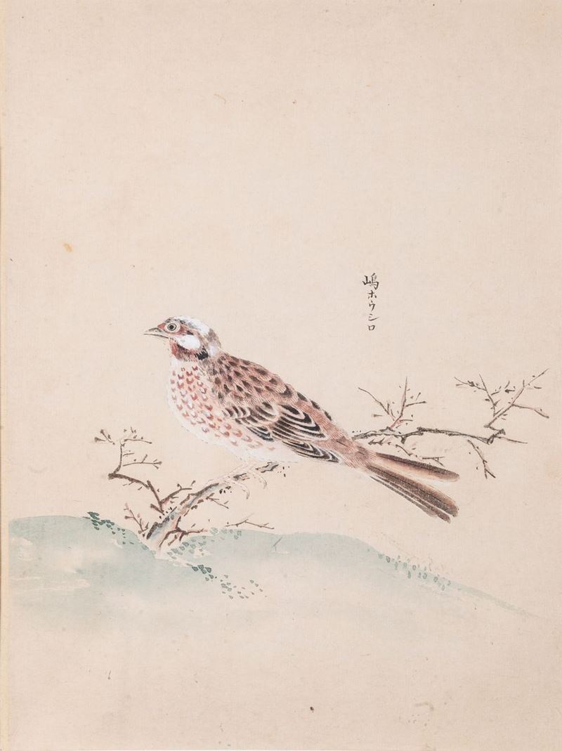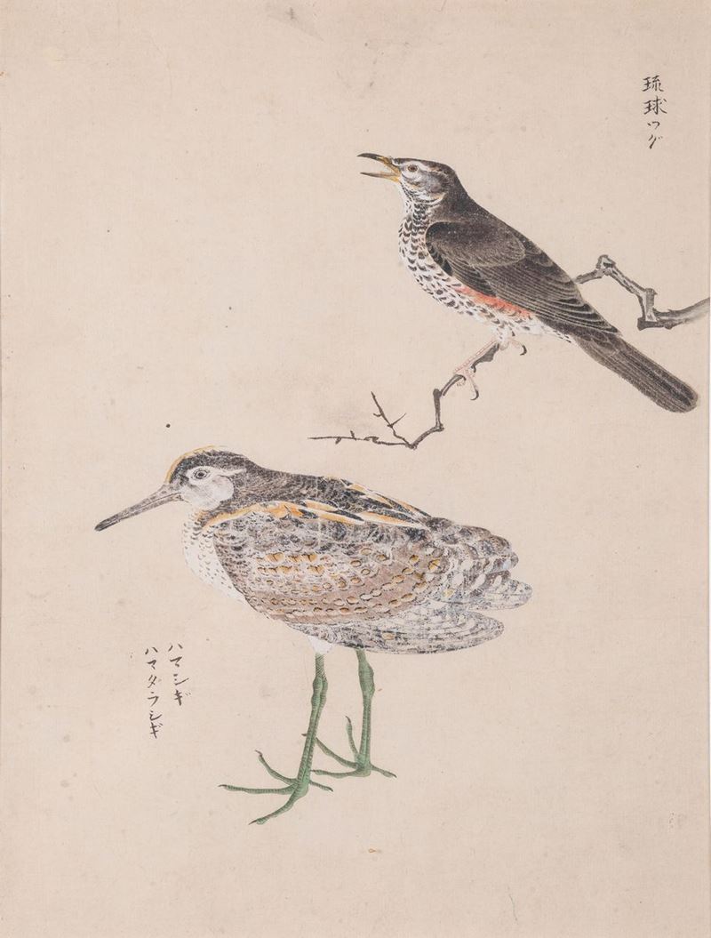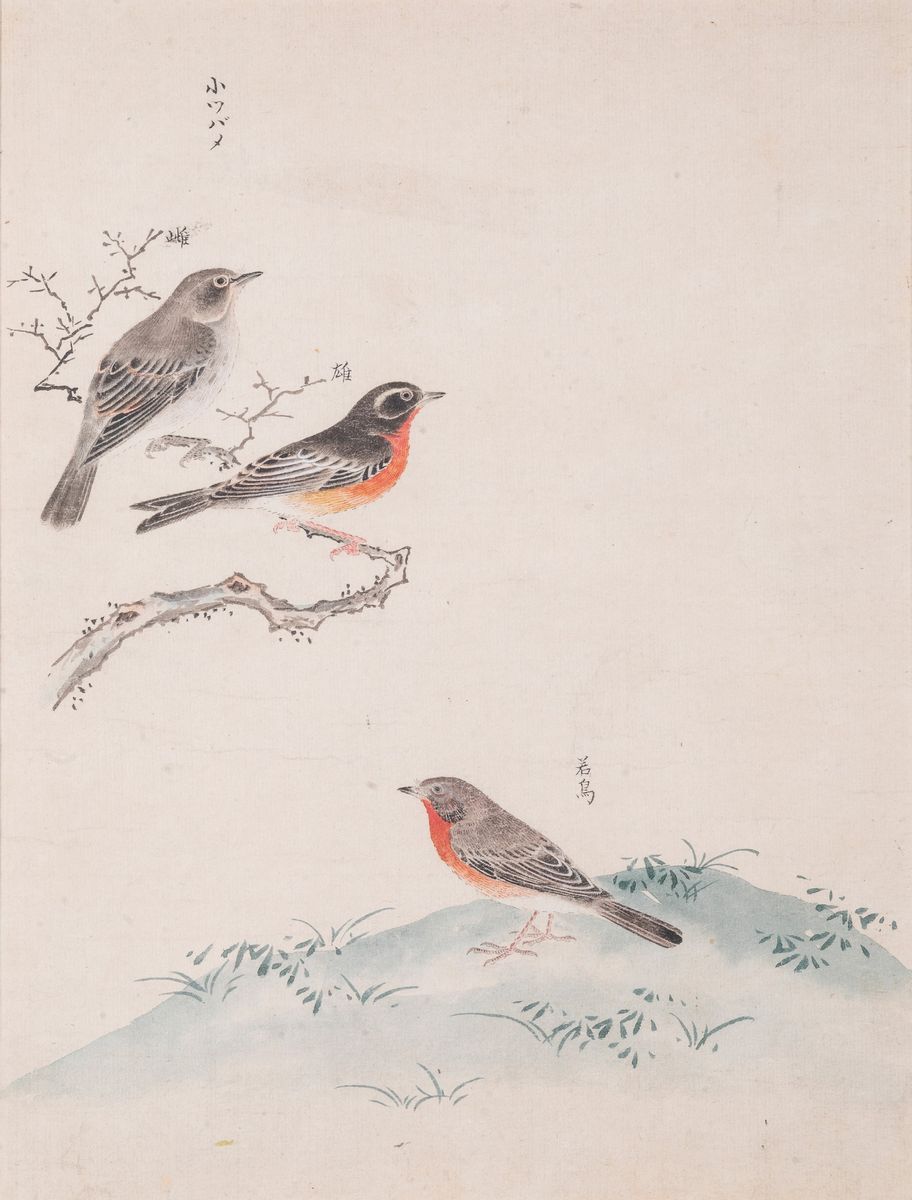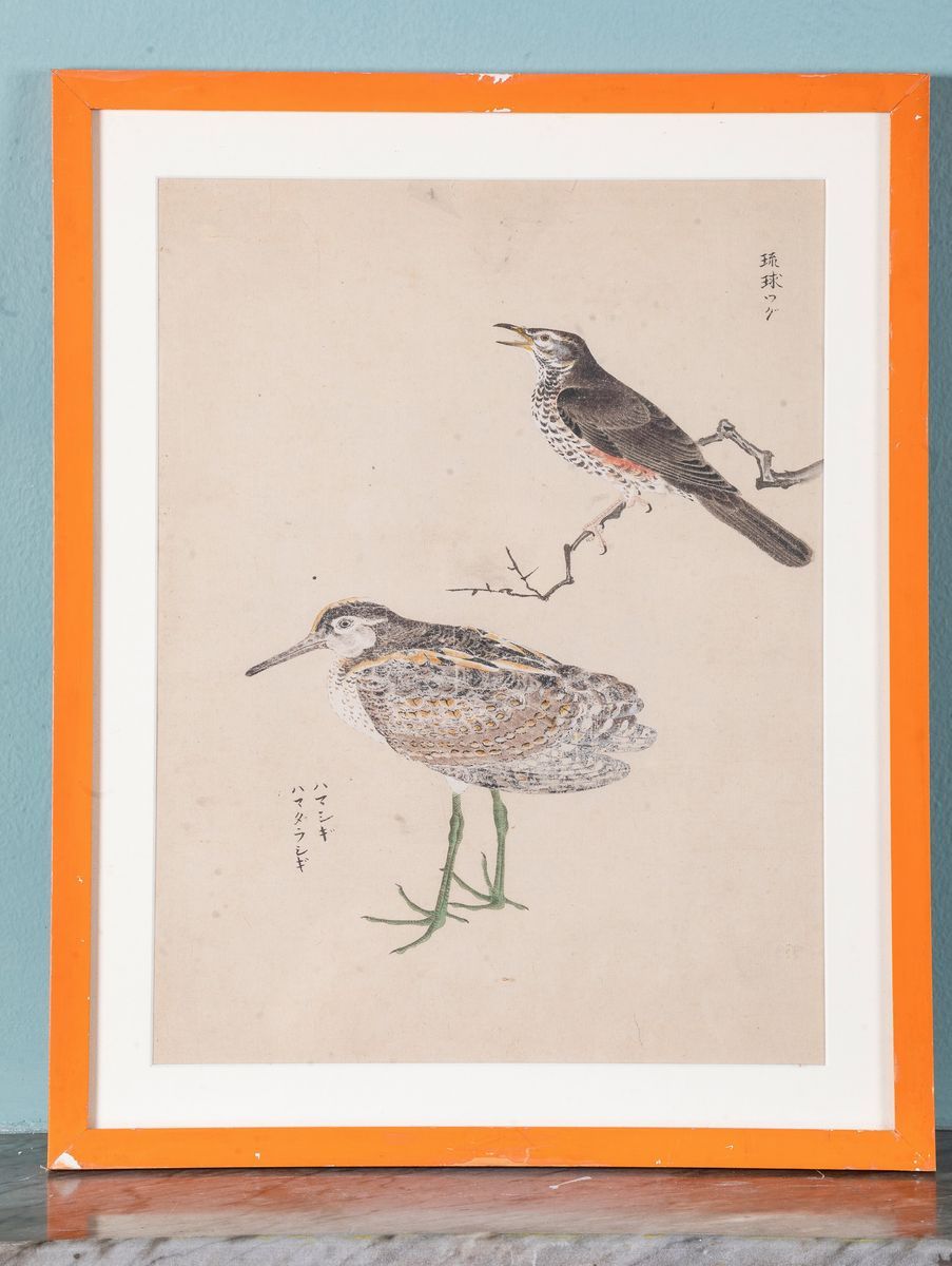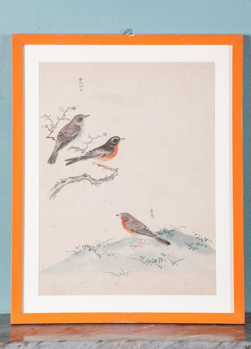 Tre stampe acquerellate su carta a tema ornitologico con iscrizioni. Giappone, XX secolo