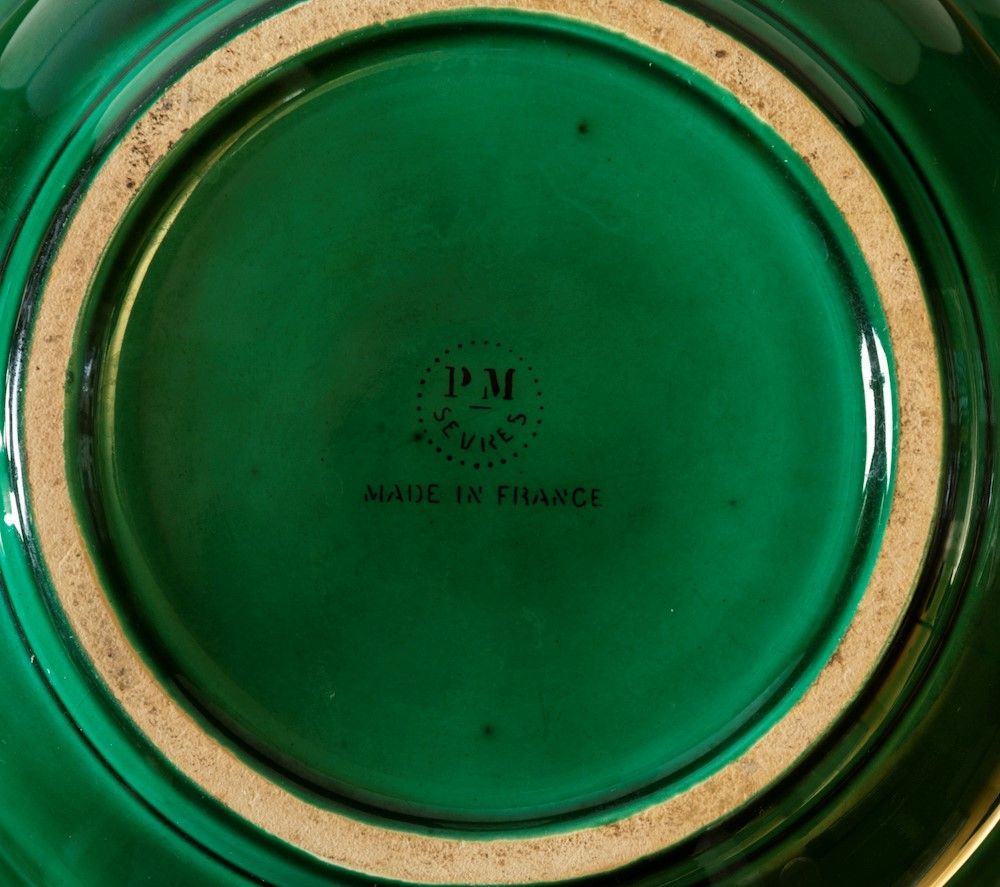 Porcellana invetriata color verde. Marca: “PM Sevres Made in France” in nero. Dimensioni: vaso altezza cm 20; alzatina altezza cm 10,9, diametro cm 23,3. Conservazione: ottima, insignificante sbeccatura al verso