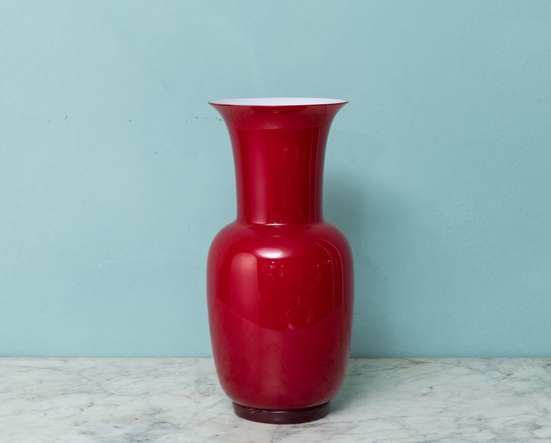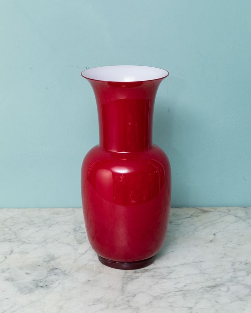 Vaso in vetro opalino incamiciato con piede a cordolo.
