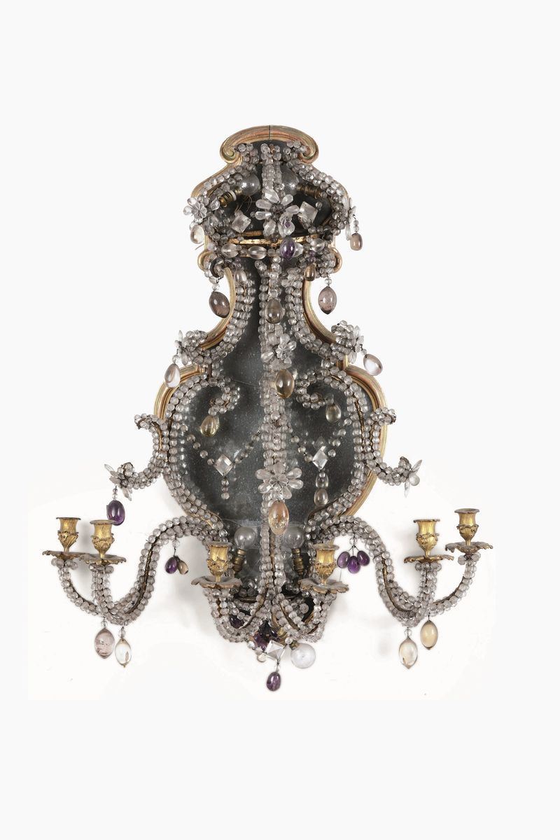 Coppia di grandi lumiere da parete a quattro luci in cristallo di Rocca, quarzo viola, ametista e citrini. Piemonte, XVIII [..]
