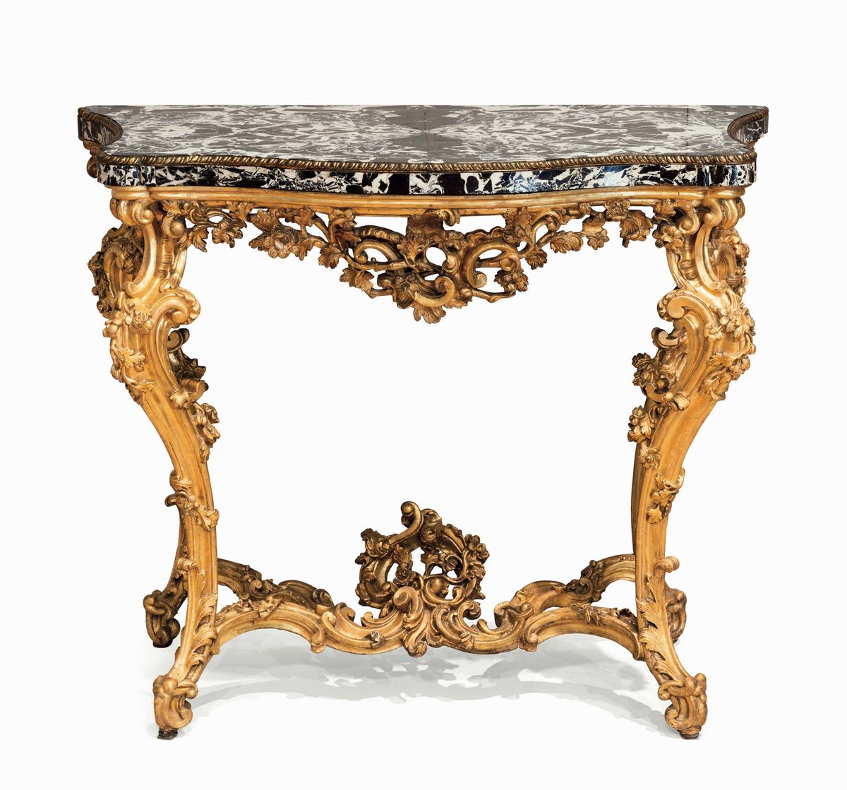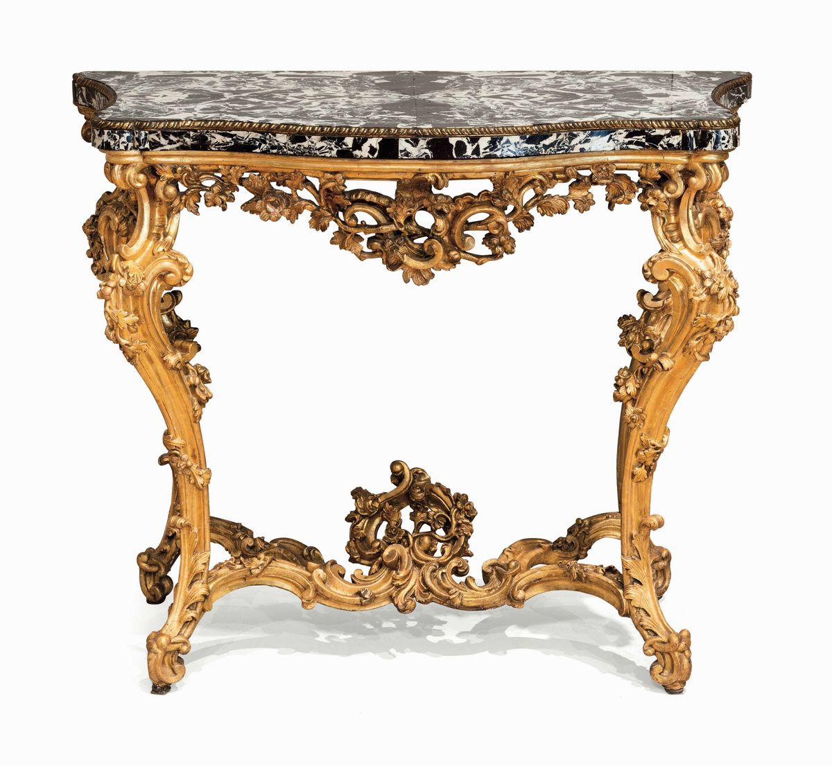 Ricchi decori a volute e motivi vegetali, fascia traforata, gambe mosse riunite da traverse ed elemento a rocailles. Piano sagomato in marmo nero d’Aquitania decorato da profilo modanato in bronzo. Lievi differenze