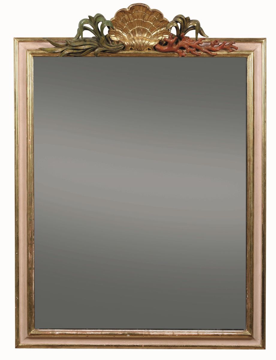 Cimasa centrata da conchiglia dorata da cui si dipartono elementi vegetali e rami di corallo in legno dipinto