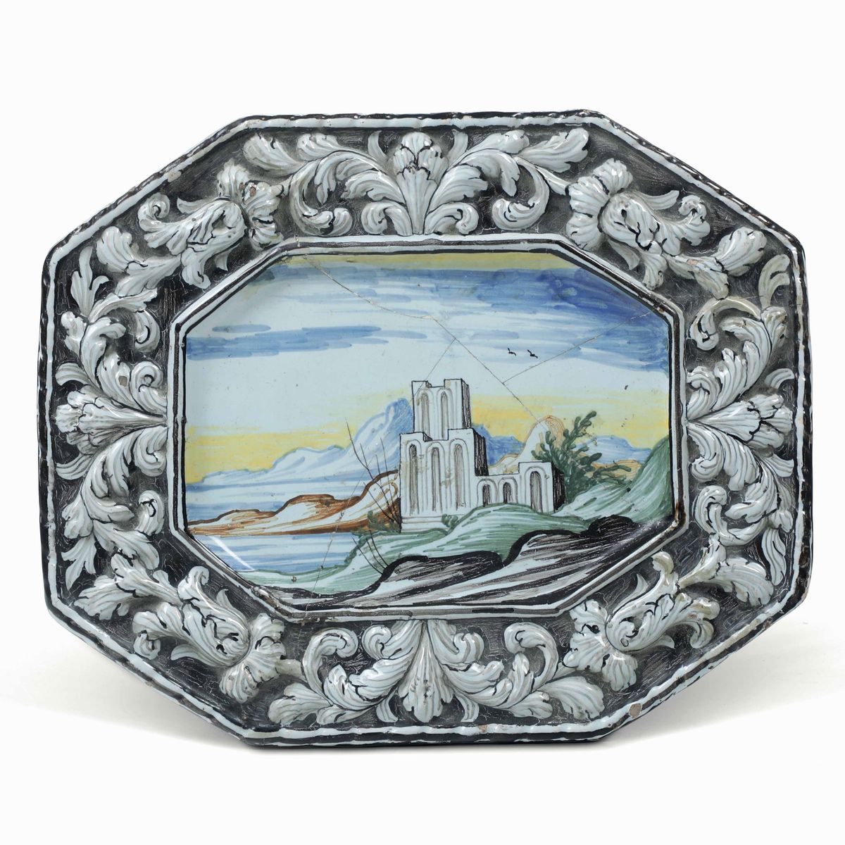 Tre piatti (due tondi e uno ottagonale allungato) sono decorati con capricci di architettura classica, animati da piccoli viandanti, col fondo a paesaggio, dipinti nell’elegante policromia, frenata nel tono, tipica della produzione delle migliori manifatture pavesi nell’ultimo ventennio del Seicento e nel primo Settecento. La decorazione della tesa con motivi fogliati a rilievo, modellata a stampo, appartiene alla loro raffinata produzione.