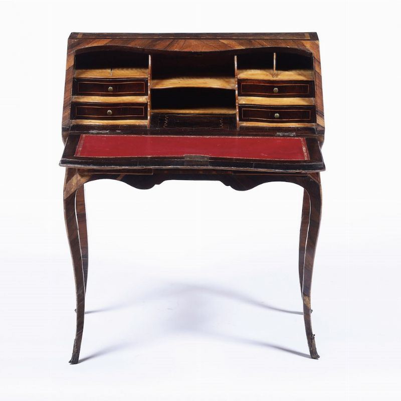 Piccolo bureau Luigi XV lastronato in palissandro e intarsiato in legno chiaro. XVIII secolo