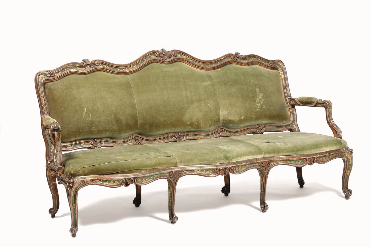 Set di un divano e due poltrone Luigi XV in legno intagliato, laccato e argentato. Probabilmente Parma, secolo XVIII