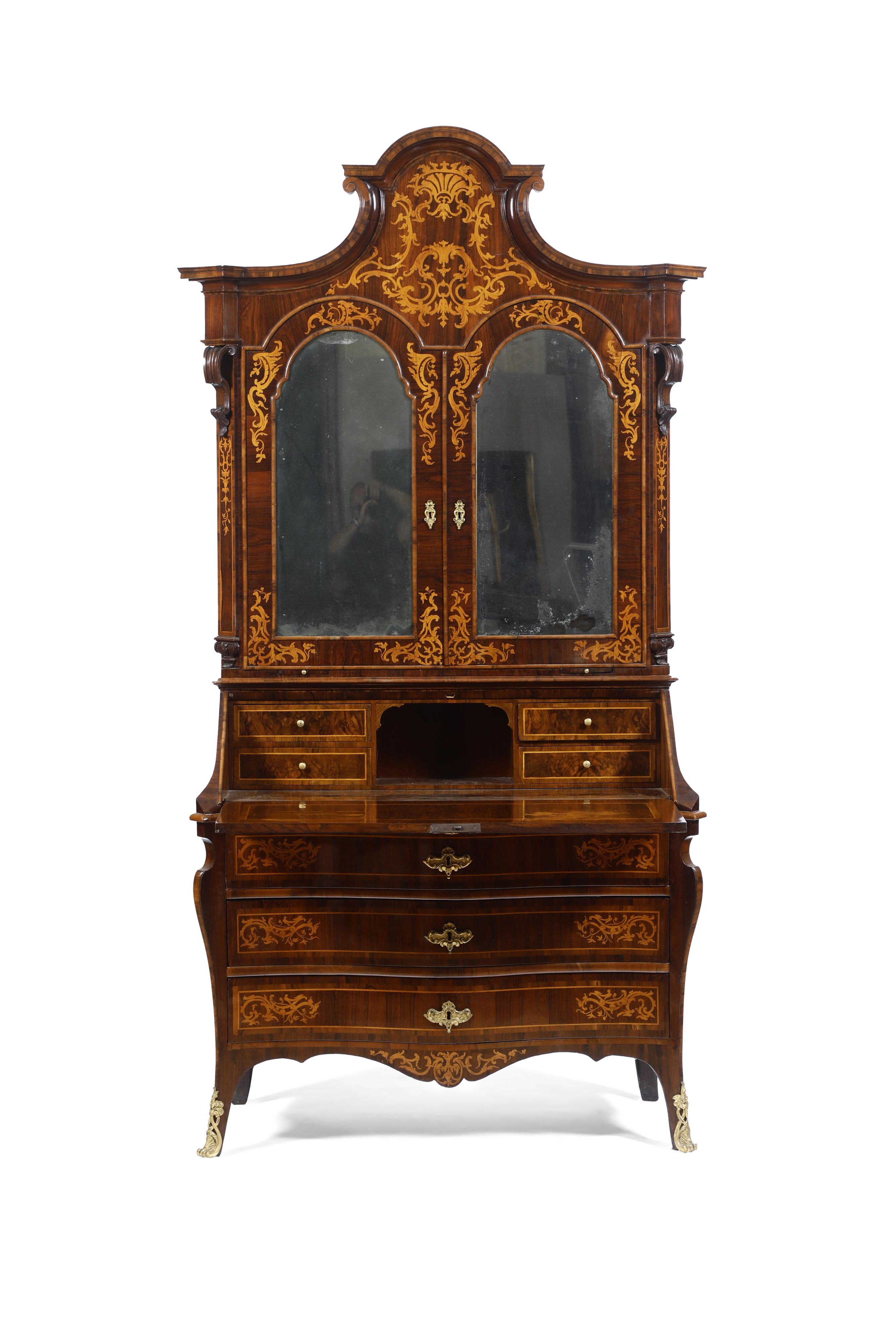 lastronato in palissandro con intarsi in acero, corpo superiore a due ante a specchio di forma centinata terminante con timpano scorniciato, interno con vani a giorno e in basso tre cassettini, corpo inferiore con fronte mosso a ribalta a tre cassetti; la superficie del fronte intarsiata a ramages vegetali e volute; bocchette e piedi in bronzo dorato e cesellato