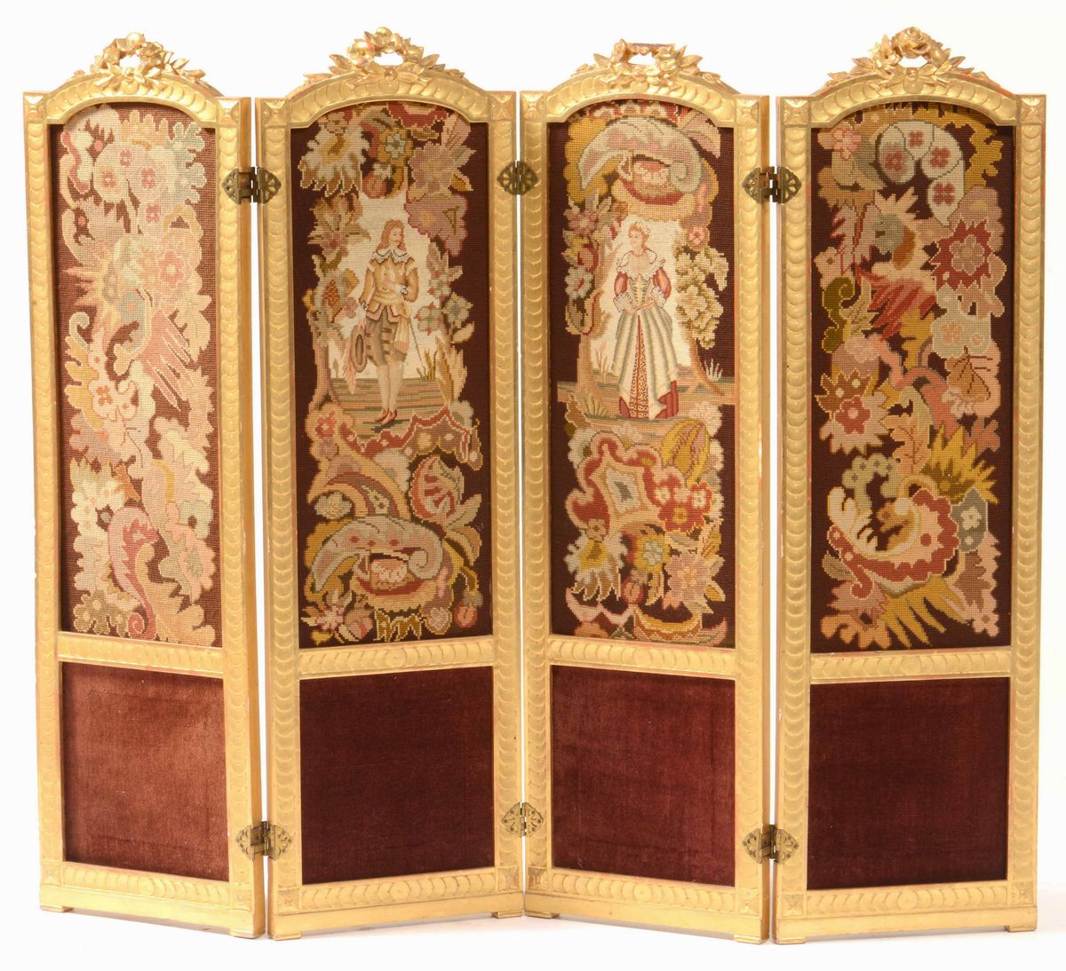 Paravento a quattro ante in legno intagliato e tessuto ricamato. XX secolo