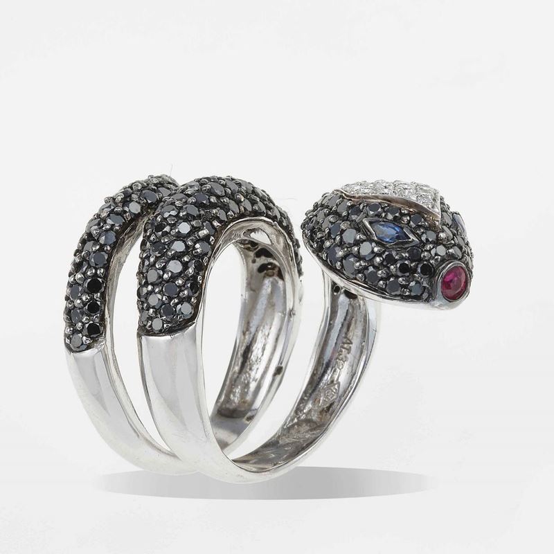 Anello "serpente" con pavè di diamanti neri e bianchi