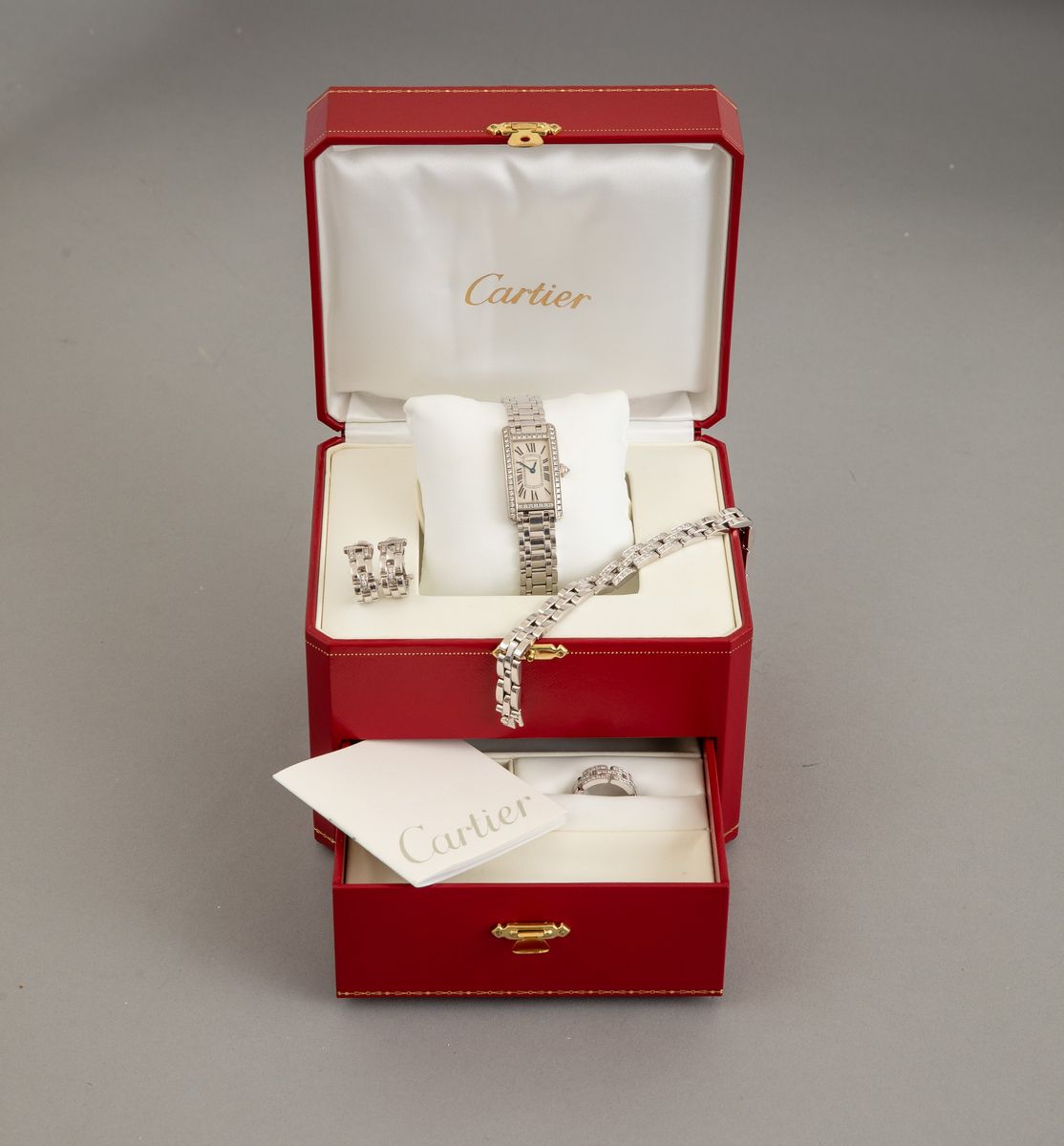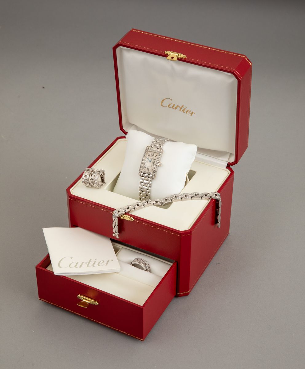 Cartier. Parure composta da anello, orecchini, bracciale ed orologio modello “Maillon Panthère”