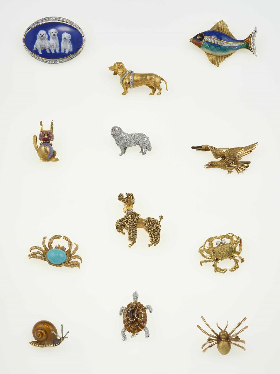 Lotto composto da 12 spille con diamanti, smalti e gemme