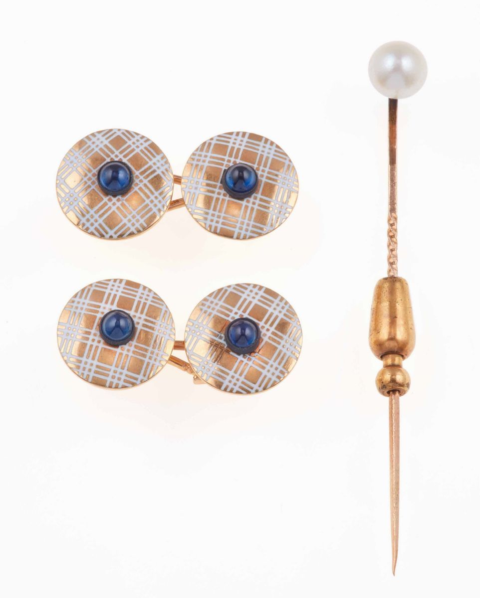 Un paio di bottoni da polso con smalto bianco e pasta vitrea blu ed uno spillone da cravatta con perla