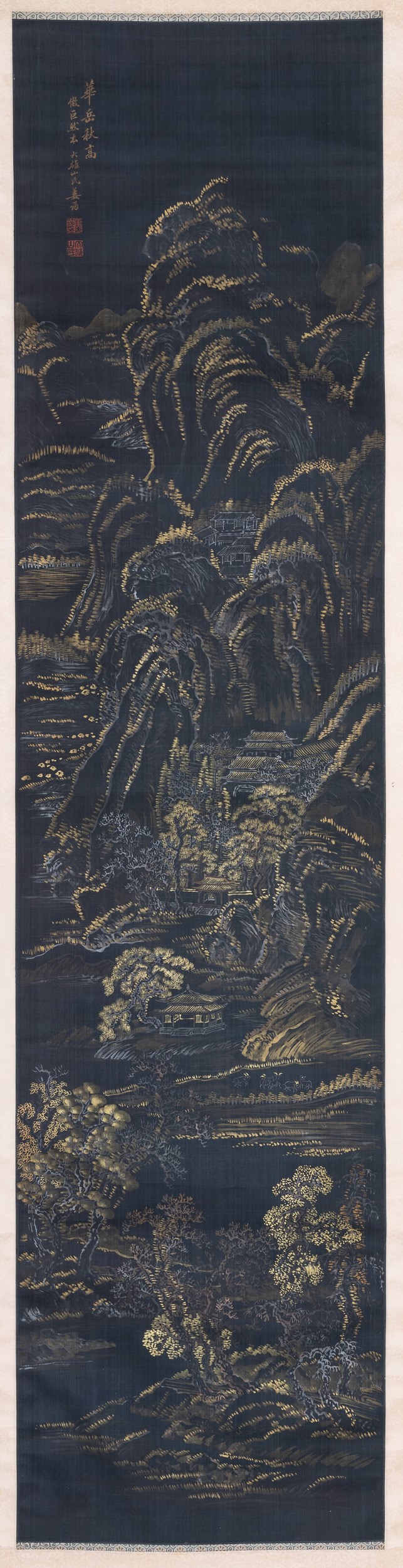 Dipinto su seta a fondo blu raffigurante paesaggio con pagode e iscrizione, Cina, Dinastia Qing, XIX secolo